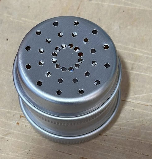 Hai mẫu khuôn đơn giản, vừa khít với đáy của các lọ mỹ phẩm nhôm 20ml và 30ml mua trên Aliexpress. Sau khi đặt khuôn vào vị trí, tôi dùng máy khoan để tạo lỗ. Dọn dẹp mạt kim loại, cạo sạch các cạnh sắc, đổ đầy chất hút ẩm và vặn chặt nắp.