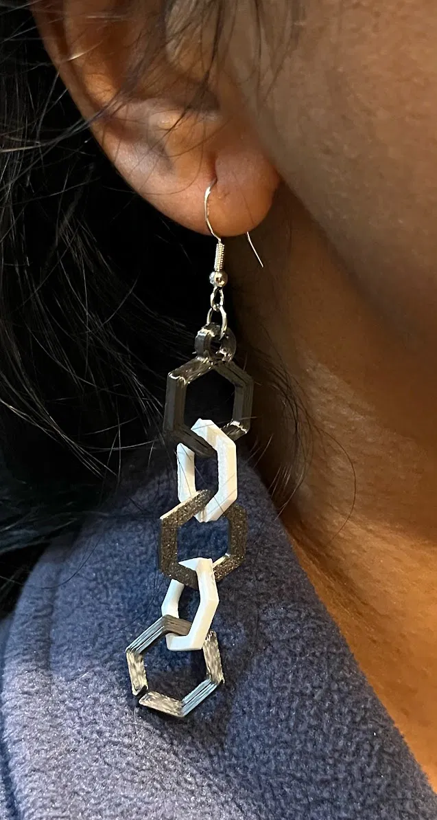 Bông tai lục giác in một lần xài được luôn, có thể phối nhiều màu sắc theo ý thích. Chất liệu PLA, PETG, không cần hỗ trợ. Có thể làm thành vòng cổ, vòng tay.