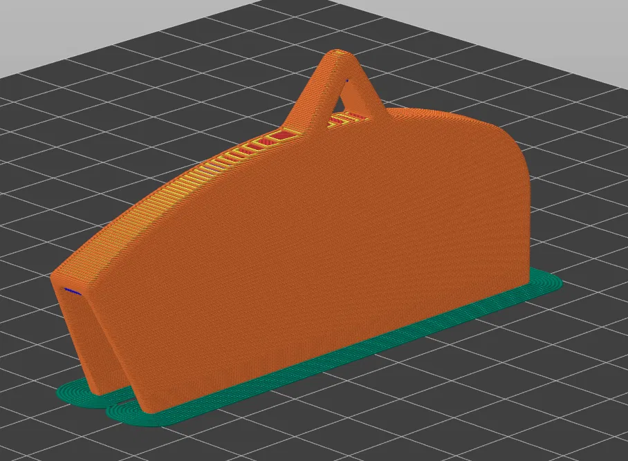 Tôi đề xuất in mẫu này với cạnh mở dài hướng xuống, phần lỗ hình tam giác hướng lên, có sử dụng brim, nhưng các cách đặt khác cũng có thể dùng được.
