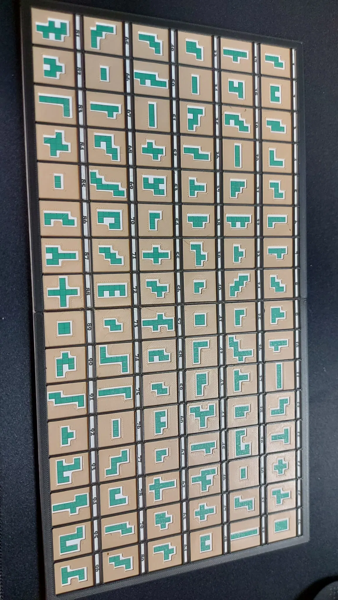96 miếng + 1x1 + pdf chip. và 1 TCEN và được in với sự thay đổi màu sắc. Được gắn trên một bảng IKEA "https://www.ikea.com/es/p/lack-mesa-auxiliar-blanco-30514791/". 96 mảnh + 1x1 + pdf của thẻ chỉ mục.