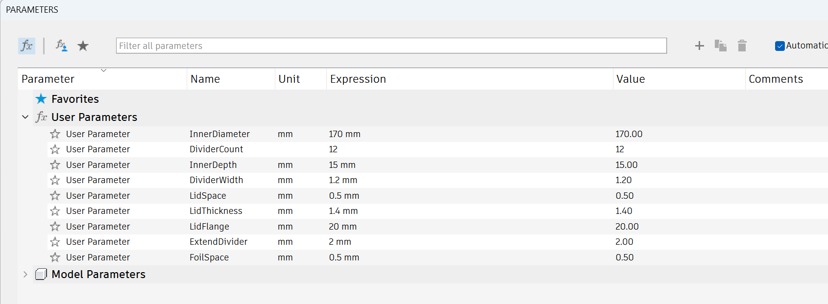 Hộp được thiết kế để có tính tham số nhất có thể, bạn có thể dễ dàng điều chỉnh đường kính, độ sâu và số lượng ngăn chứa. Hãy kiểm tra cửa sổ thông số người dùng trong Fusion360.