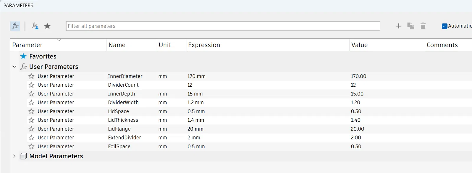 Hộp được thiết kế để có tính tham số nhất có thể, bạn có thể dễ dàng điều chỉnh đường kính, độ sâu và số lượng ngăn chứa. Hãy kiểm tra cửa sổ thông số người dùng trong Fusion360.