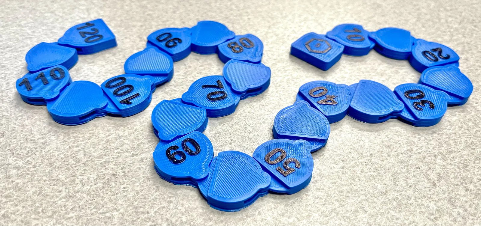 Các file được cung cấp bao gồm các đường link có đánh số và không đánh số. Có một khối bắt đầu với đầu vuông được dán nhãn "5", ngoài ra chỉ có các khối đại diện cho các bội số nguyên của 10 mới được dán nhãn. Các nhãn số sử dụng font Arial Bold.
