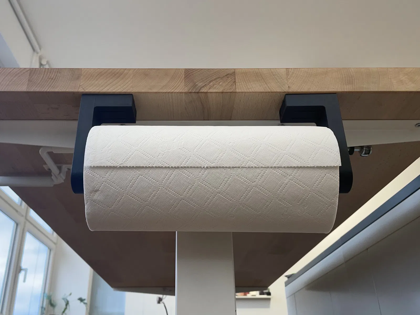 Thiết kế đơn giản gồm hai phần cho giá đỡ cuộn giấy nhà bếp. In hai cái "fixture" (cái gá) và hai cái thân rồi bắt "fixture" vào mặt dưới của bàn hoặc tủ.