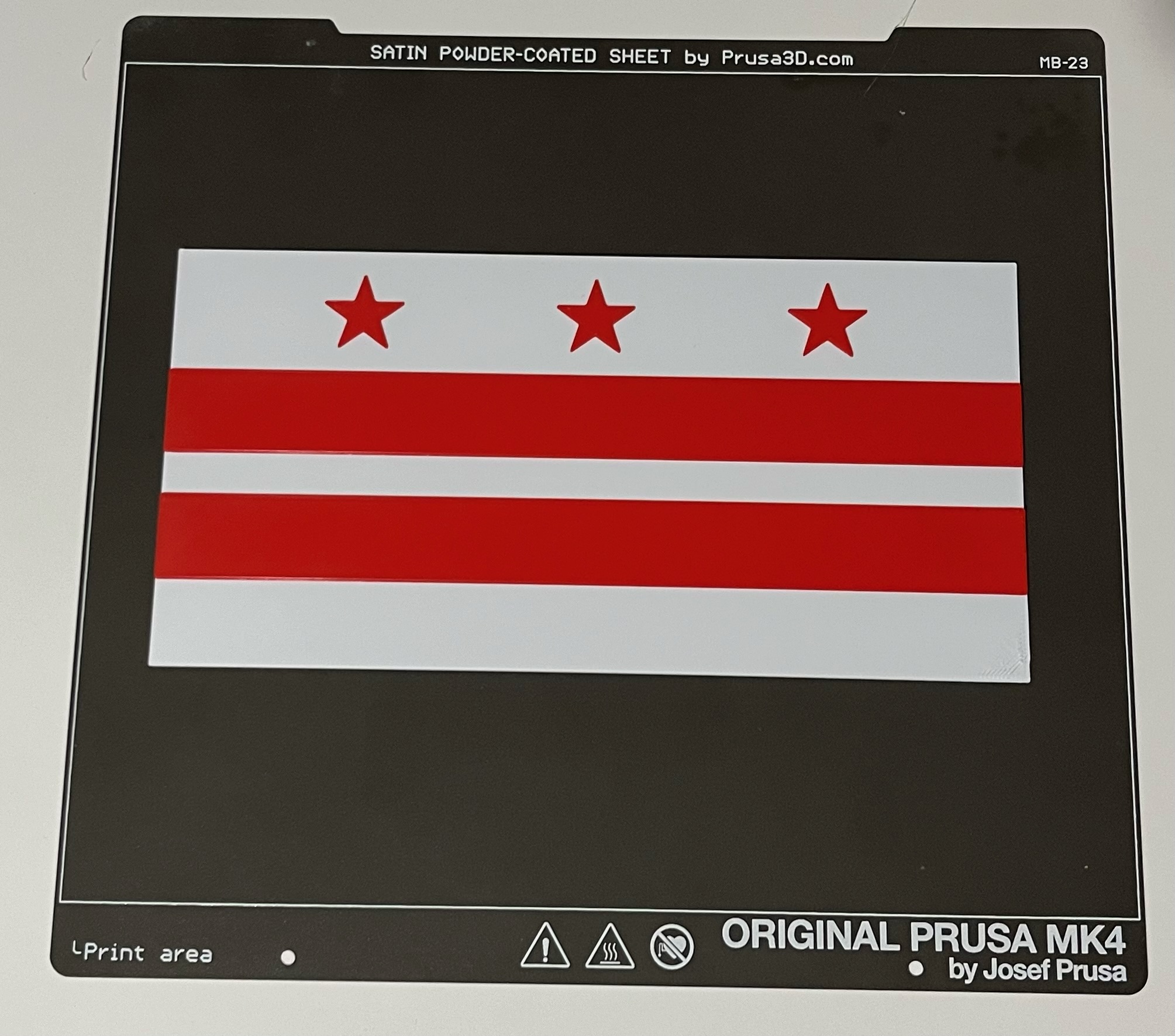 Đây là lá cờ cho sự thật thú vị của Thành phố Washington D.C., tôi phát hiện ra rằng kích thước chính thức của lá cờ dài hơn một chút sau đó là một lá cờ tiêu chuẩn. Ở quy mô thông thường của tôi, nó sẽ không phù hợp với tấm xây dựng MK4 do chiều dài. Vì vậy, tôi đã in nó ở tỷ lệ 75%. Nếu bạn đang chia tỷ lệ cờ, hãy chắc chắn chỉ chia tỷ lệ kích thước x và y. Thay đổi chiều cao Z có thể thay đổi số lượng lớp và màu sắc có thể không mờ đục.