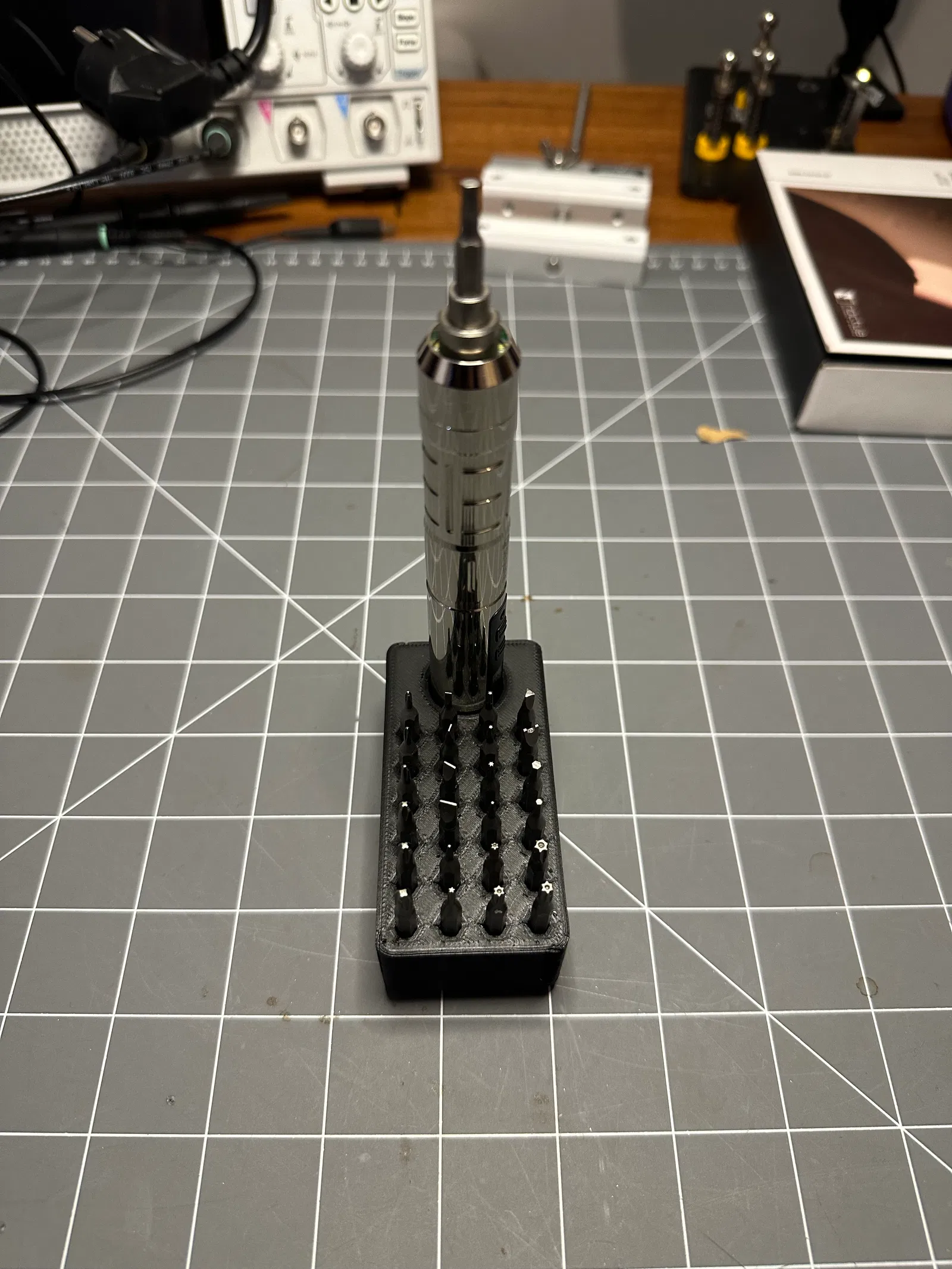 Một module 1x2 đơn giản để dựng đứng cây tua vít ES126 cùng với tất cả các đầu vặn của nó. ### Ghi nhận công lao * Gridfinity của Zack Freedman