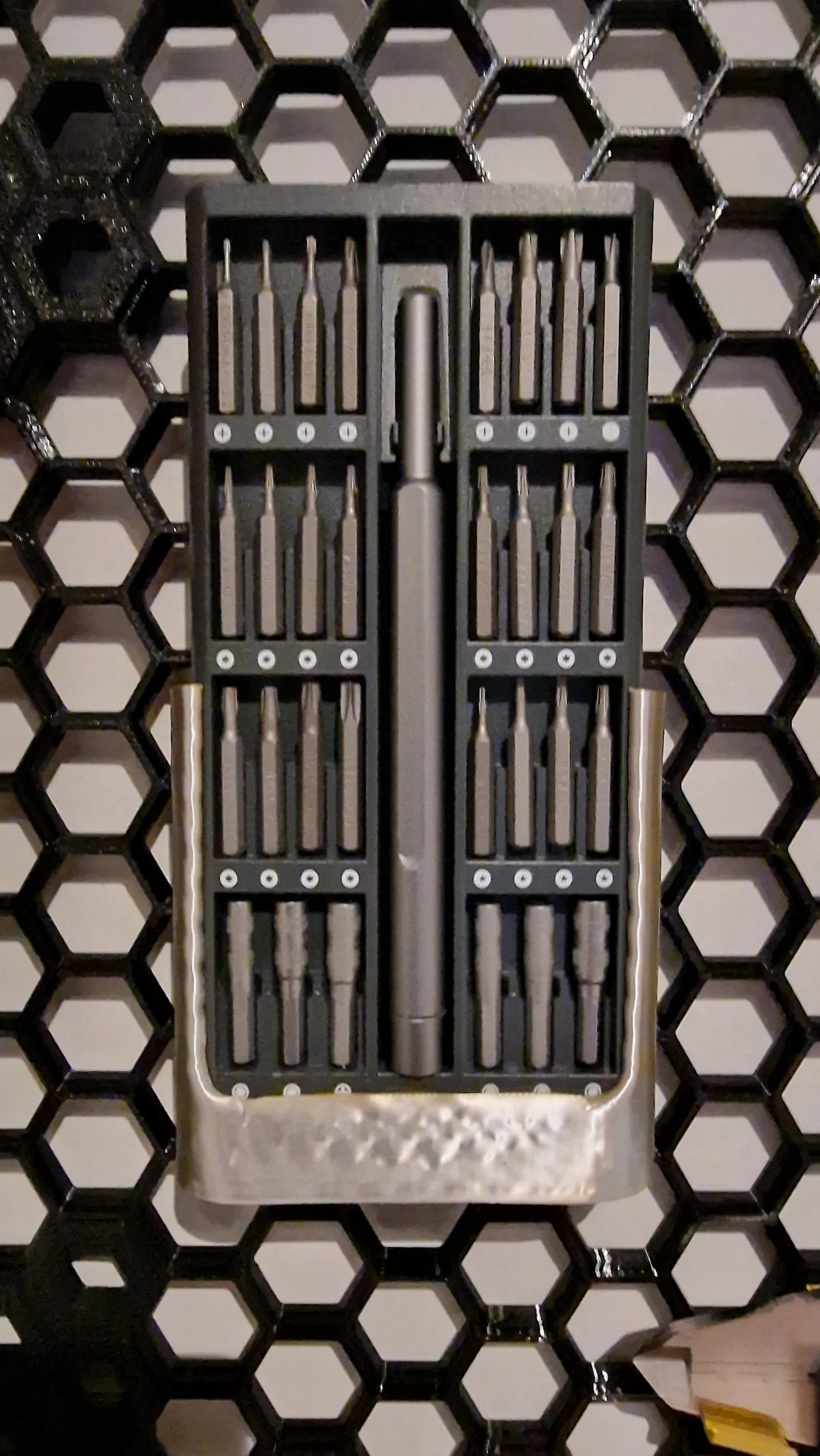 Kệ giữ bộ tua vít 63 món HCW, được làm bằng Tinkercad. Sản phẩm có độ fit khá sát, có thể cần dùng súng nhiệt để lắp đặt. Sản phẩm là một giải pháp lưu trữ tiện lợi cho bộ tua vít của bạn.