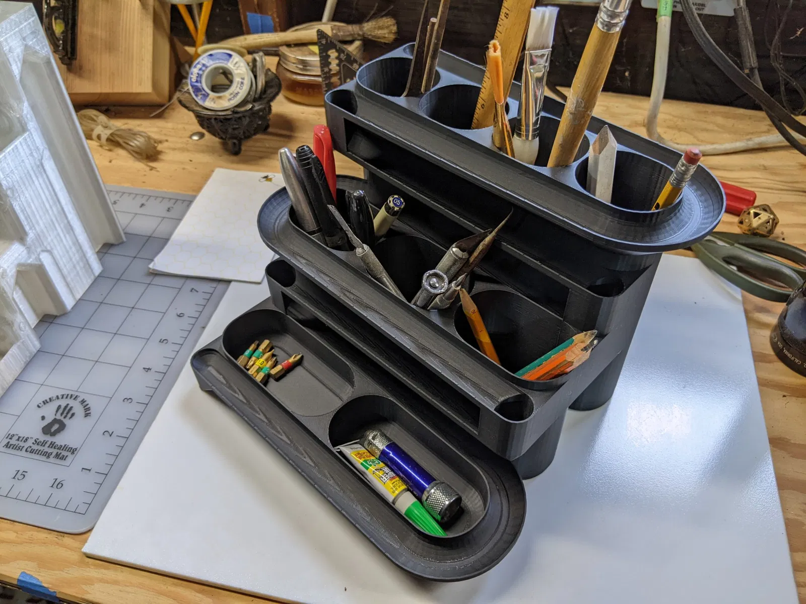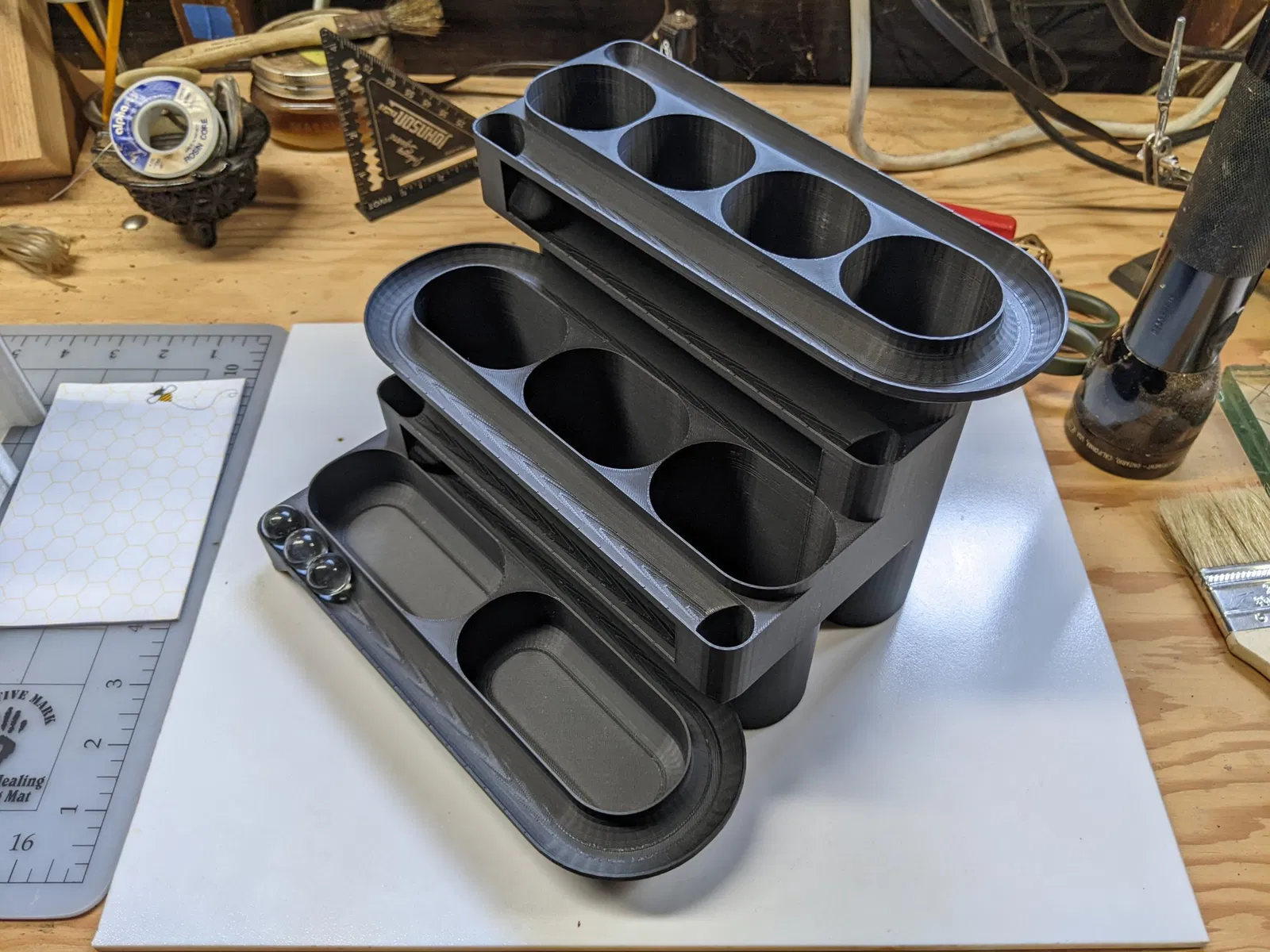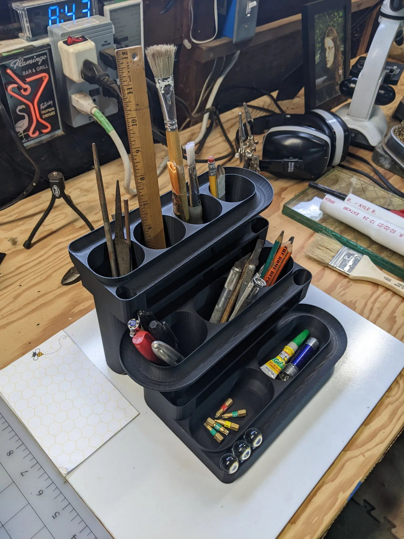 Thật lòng mà nói, tôi không thấy những người tổ chức như thế này hữu ích lắm, công cụ của tôi quá đa dạng và thường thì tôi thấy chúng dễ tiếp cận nhất khi được lưu trữ trong những đống lộn xộn. Vì vậy, tôi đã nghĩ… Tại sao không làm một tổ chức bàn làm việc cổ điển với một chút biến tấu và biến nó thành một loại đồ chơi/thiết bị xoay tay mà tôi có thể chơi nếu việc tổ chức không thành công. Haha! Tôi nghĩ điều đó sẽ dễ dàng, một khái niệm đơn giản, một chút đường ray và những khúc ngoặt xung quanh các khoang lưu trữ. Cuối cùng, nó đã mất khoảng năm ngày, mỗi ngày trung bình năm giờ. Vậy là… 25 giờ! Chao ôi. Nhưng cuối cùng, tôi rất hài lòng với kết quả và tôi hy vọng bạn cũng sẽ như vậy. Cảm ơn bạn đã ủng hộ Neotoy Lab! Sử dụng cài đặt mặc định trên P1P của tôi, nó mất khoảng 16 giờ để in và sử dụng khoảng 400 gram filament. Đường ray hoạt động tốt nhất với bi chuẩn <18mm. Những viên bi trong video là những viên bi bị nghẹt từ bên trong chai Ramune. p. s. đây là cho cuộc thi “Phụ kiện Văn phòng” năm 2023 tại đây trên F3D.