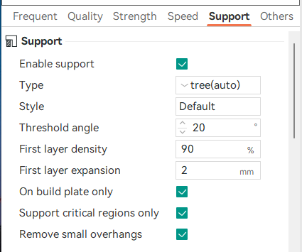 Sử dụng hỗ trợ chỉ từ build-plate; và góc ngưỡng tối đa 20% để tránh in các hỗ trợ không cần thiết. Tôi chỉ cần hỗ trợ dưới phần kẹp vào bàn (xem ảnh chụp màn hình).