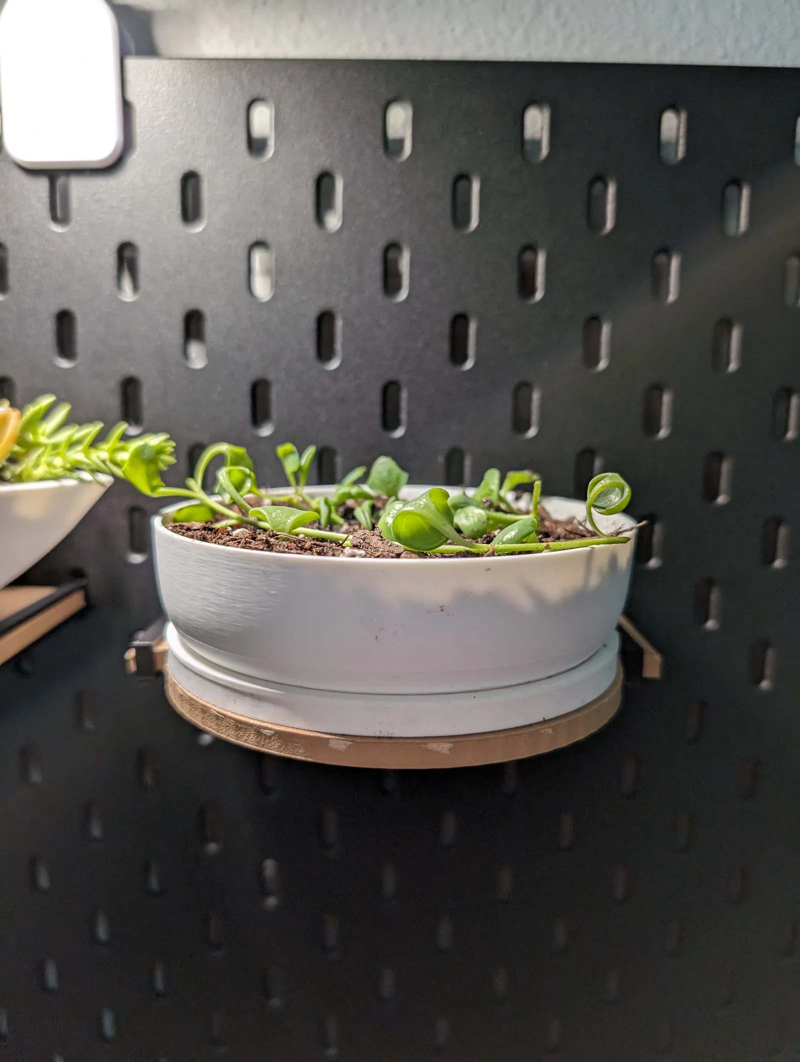 Làm lại kệ Skadis của Mima19 để đựng chậu cây tròn 11cm, có thêm phần hỗ trợ. (@Mima19_190269). Mở rộng hình dạng kệ thành hình bán nguyệt thay vì hình chữ nhật và thêm các thanh chống vào giá đỡ kệ để tăng độ ổn định.