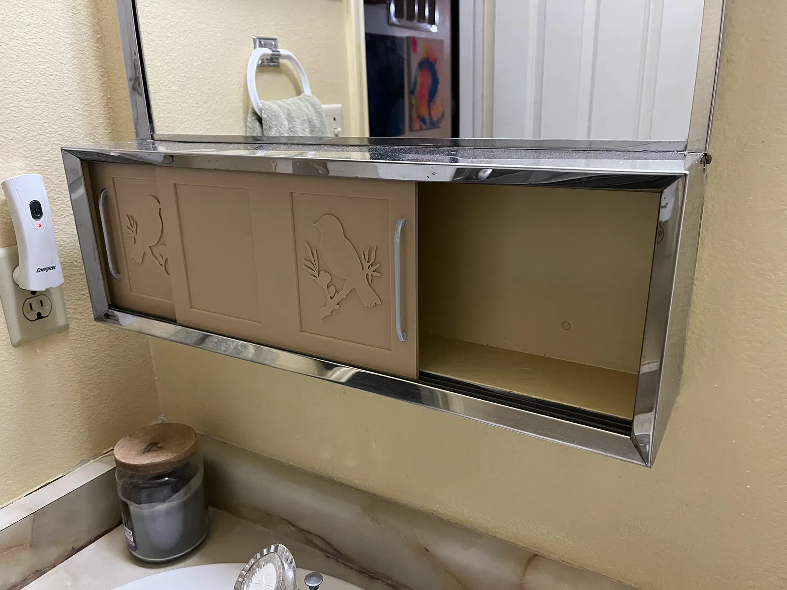 Một bản chỉnh sửa của Cửa tủ thuốc nhà mình, có thêm hình con chim sẻ và tay nắm. Phiên bản này mang phong cách giữa thế kỷ, lấy cảm hứng từ những năm 1950, 1960, 1970, rất hợp để làm cửa tủ thuốc trượt trong phòng tắm.