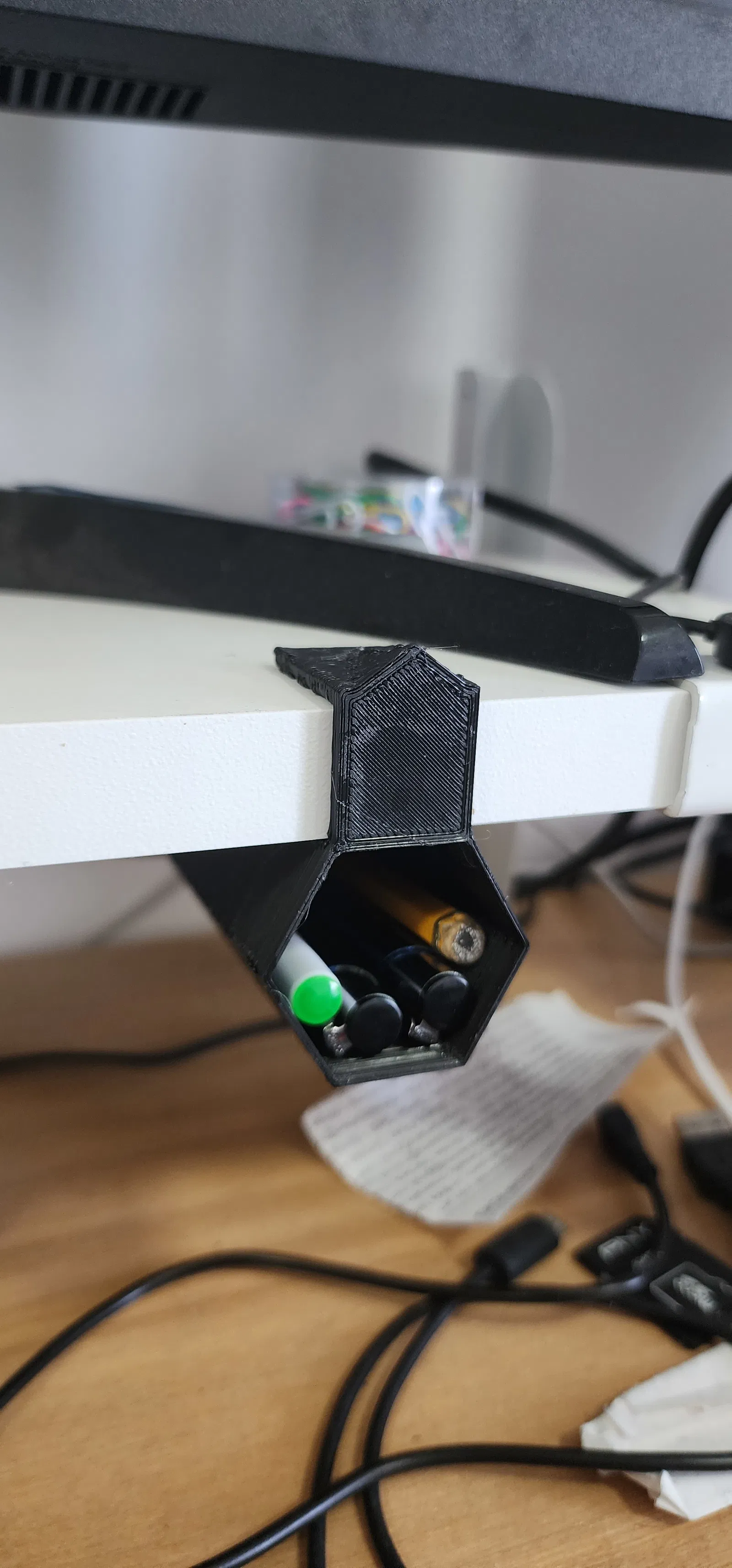 Ý tưởng là lưu trữ các điểm đánh dấu/bút chì của bạn phía trên bàn của bạn để giữ cho bàn của bạn sạch sẽ và trống bằng cách sử dụng kệ riser màn hình của bạn hoặc bất kỳ kệ nào khác ở trên.