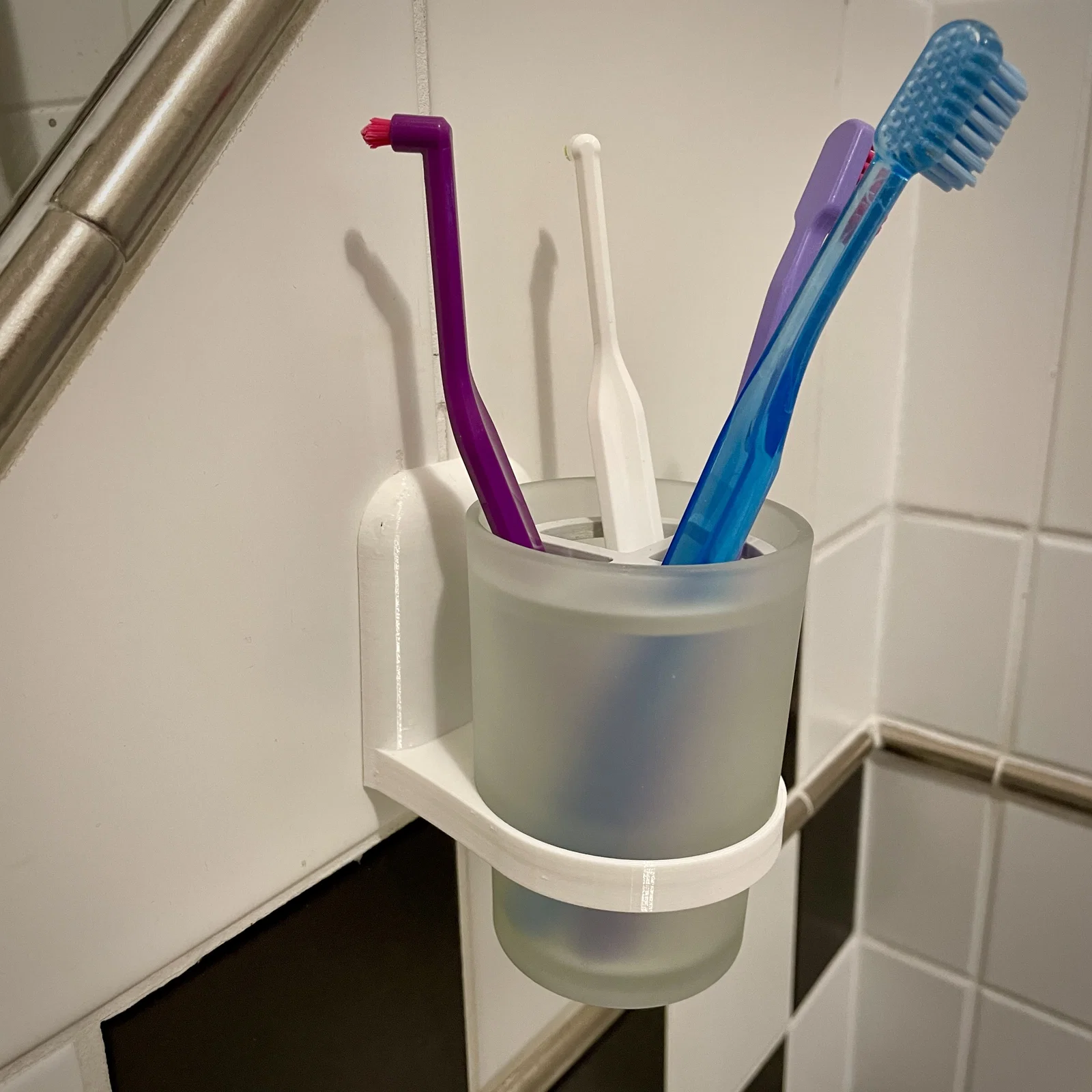 Giá đỡ ly bàn chải đánh răng, thiết kế cho ly thủy tinh "Bemeta" của Hornbach, đường kính trong 55 mm. Dễ in, không cần chống đỡ. Bạn có thể in thêm vách ngăn 4 mảnh để đặt vào bên trong ly. Lỗ bắt vít như trong ảnh.