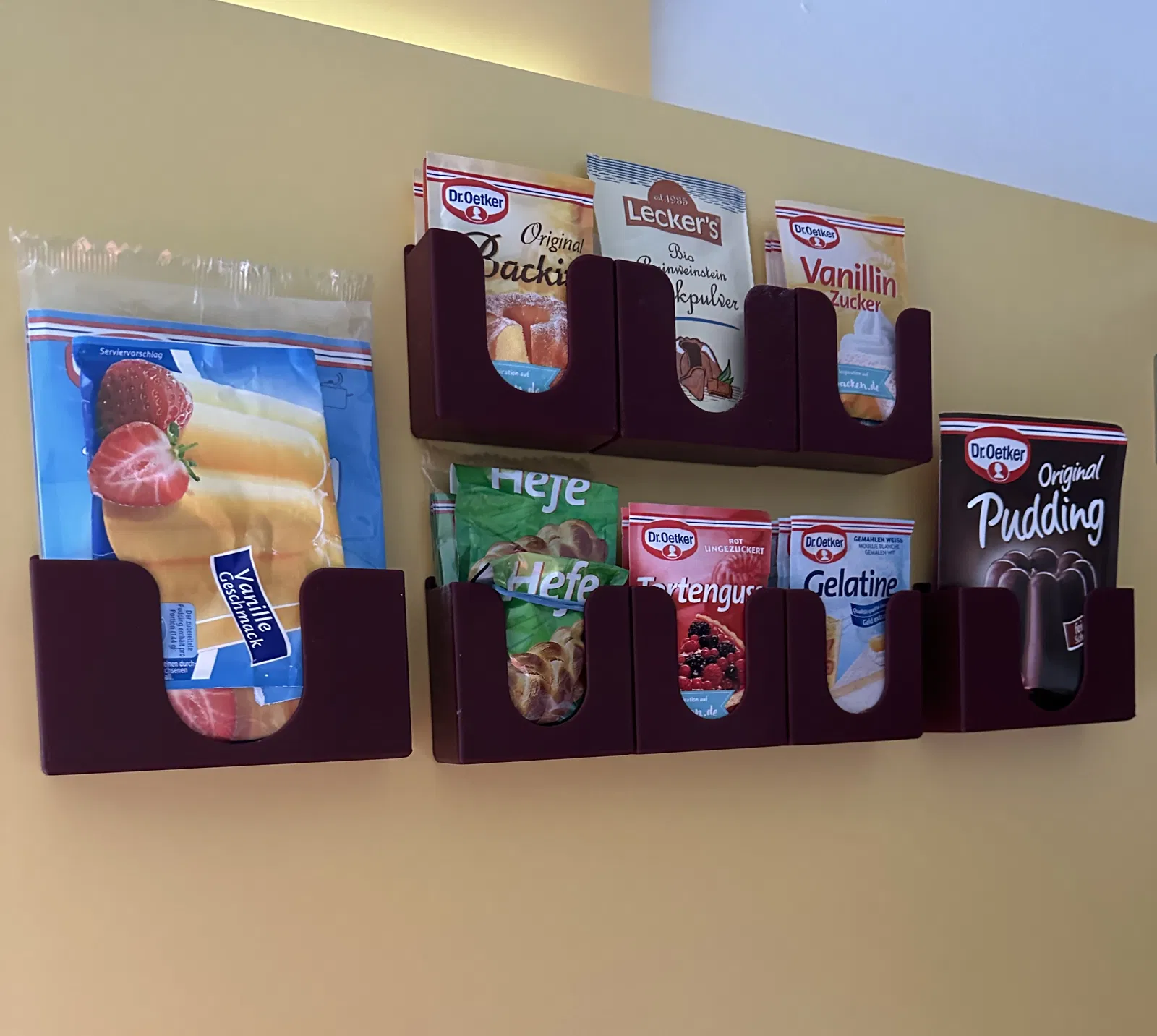 Để tủ bếp được gọn gàng, giá đỡ này giúp bạn sắp xếp các gói bột nở, bột pudding và bột cream of tartar của Dr. Oetker một cách ngăn nắp. Lắp đặt dễ dàng bằng băng dính 3M. In bằng PLA, không cần cấu trúc nâng đỡ.