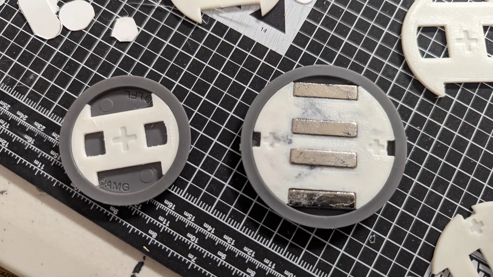 Thay vì xài cục nam châm bự chảng để đảm bảo nó hút mấy cái đế khác lại với nhau, tui thiết kế cái đế này để giữ lượng nam châm vừa đủ để mấy con mini nó tiếp xúc với nhau mà không bị hút lung tung hết.