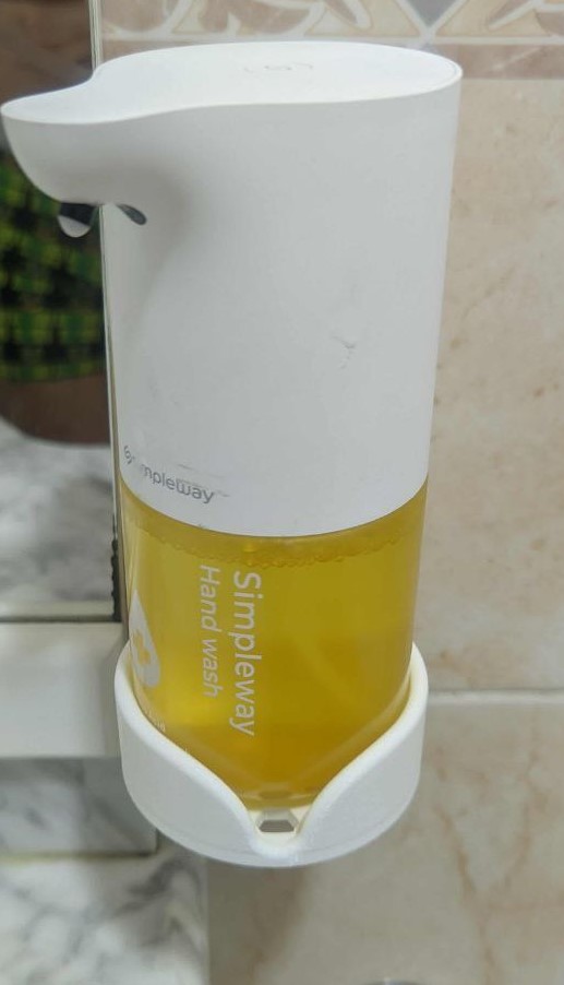 Giá đỡ treo tường cho máy pha xà phòng tự động Simpleway, có thể dùng với băng dính hoặc ốc vít. Bao gồm vòng thử nghiệm để đảm bảo độ khít và giá đỡ chính. Hướng dẫn chi tiết cách lắp đặt và cảnh báo khi thay xà phòng mới. Đã cập nhật thêm phiên bản gia cố và mẫu mới.