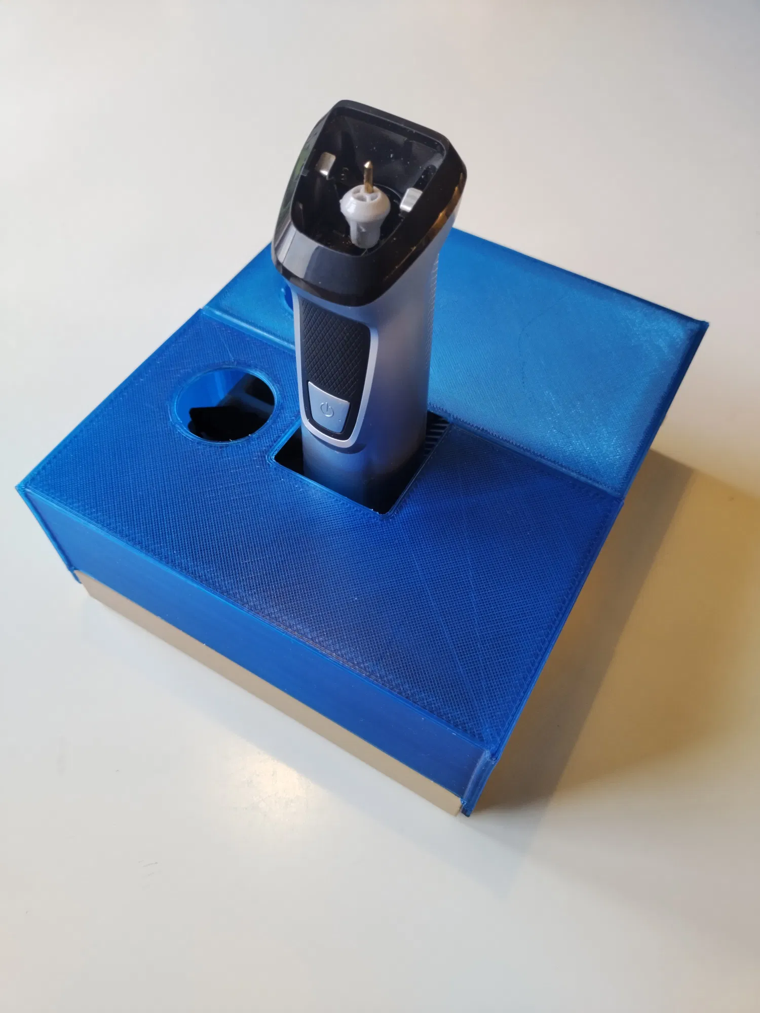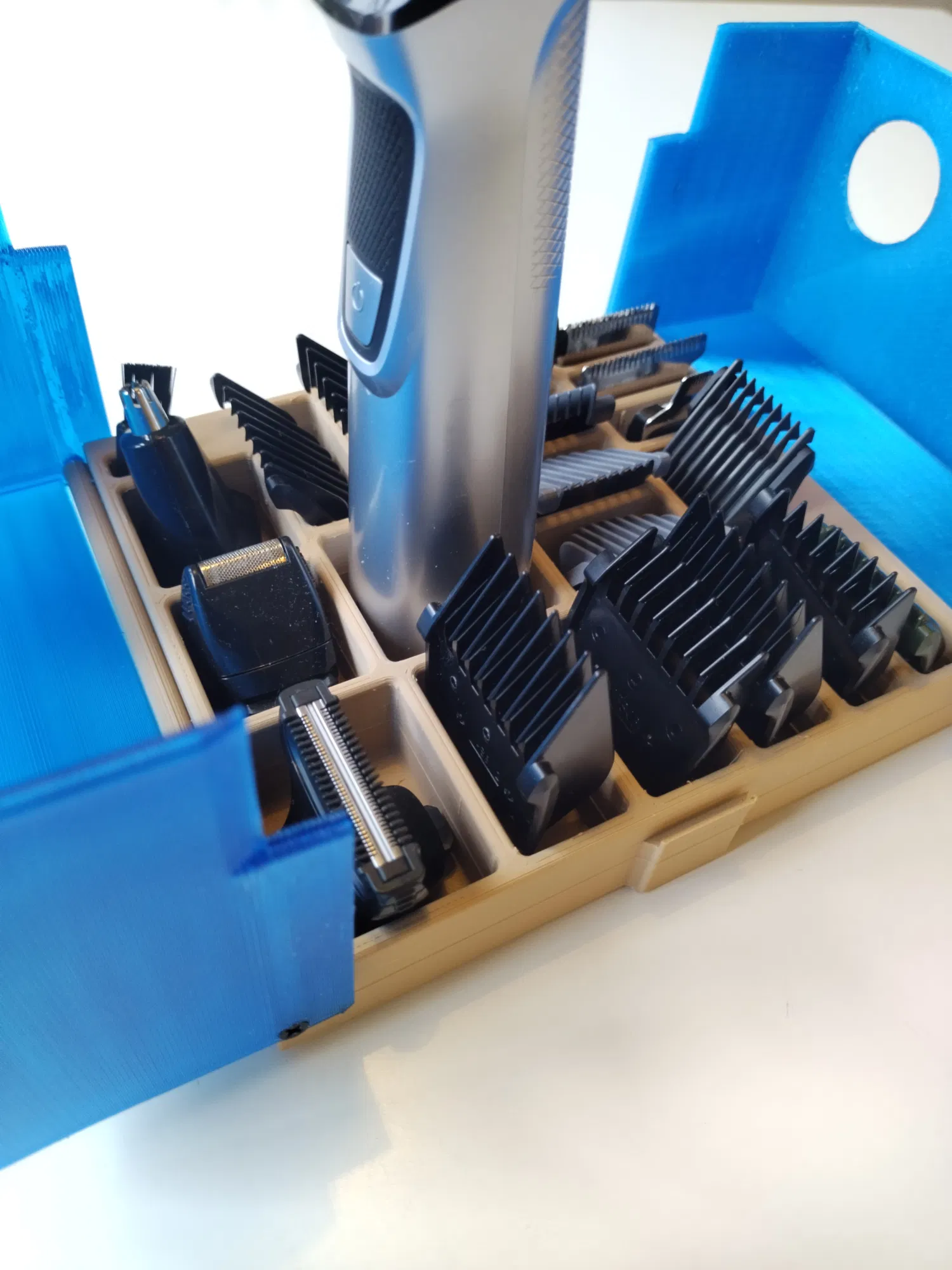 Hộp đựng và sắp xếp cho máy cạo râu Philips Multigroom Serie 7000 19-in-1 và phụ kiện. Thiết kế để in bằng PETG, có thể cần điều chỉnh nếu in bằng PLA. Yêu cầu 2 vít nhựa 3mm. Xem các sản phẩm thực tế của bạn!