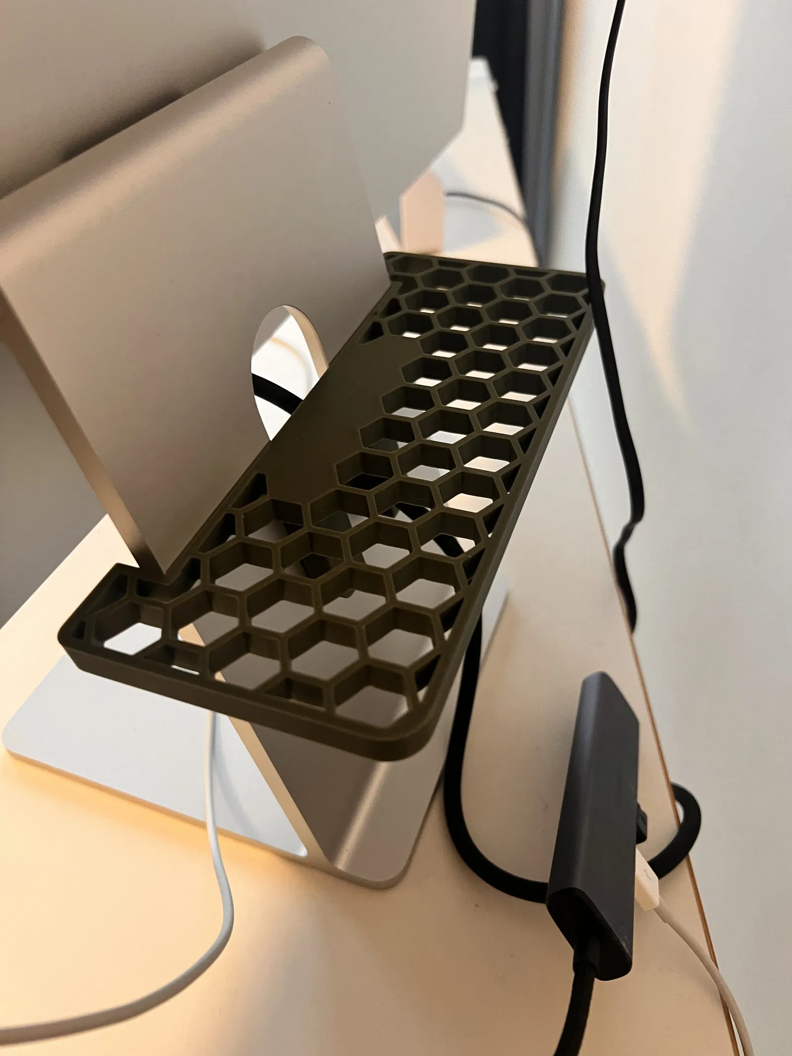 Một cái bàn nhỏ để giấu đồ phía sau màn hình, như ổ cứng, adapter, v.v. Thích hợp cho anh em hay để mấy món đồ công nghệ lỉnh kỉnh sau màn hình Studio Display.