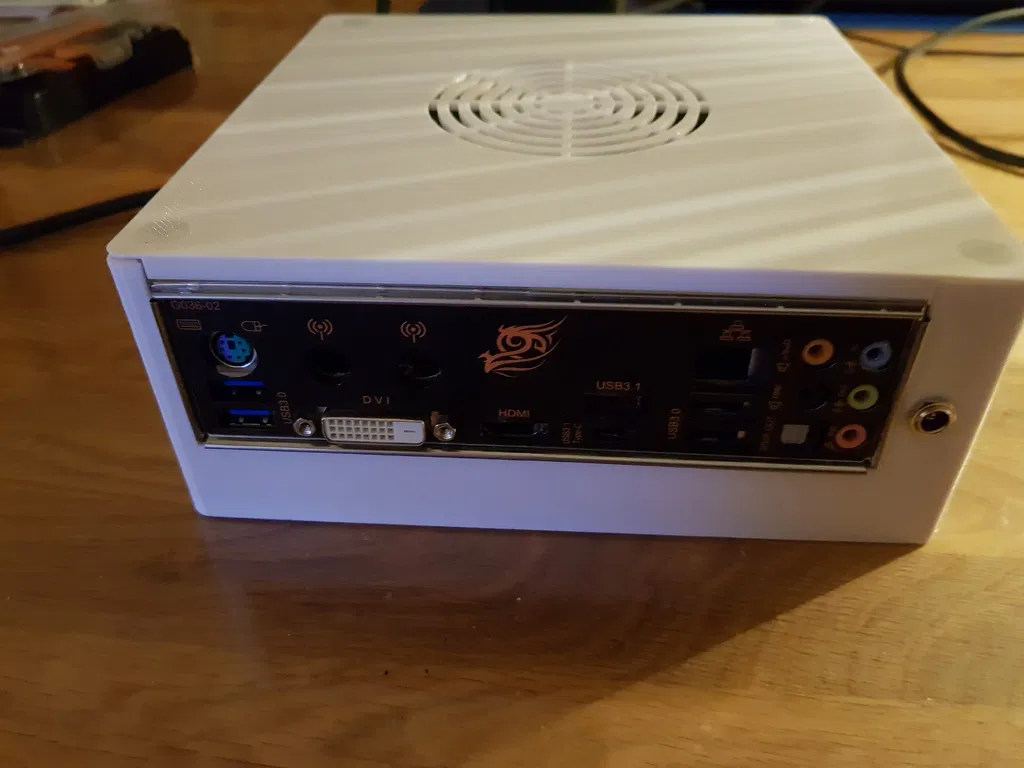 Vỏ case ITX cho các bo mạch 6,7 x 6,7 inch (Kích thước Case 19cm x 19cm x 7,7cm Dài x Rộng x Cao). In bằng PETG, dĩ nhiên bạn cũng có thể dùng vật liệu khác :-) Mất một lúc để mình chỉnh sửa cho mọi thứ ổn thỏa. Phần ốp lưng phía sau giờ cũng vừa vặn rồi.