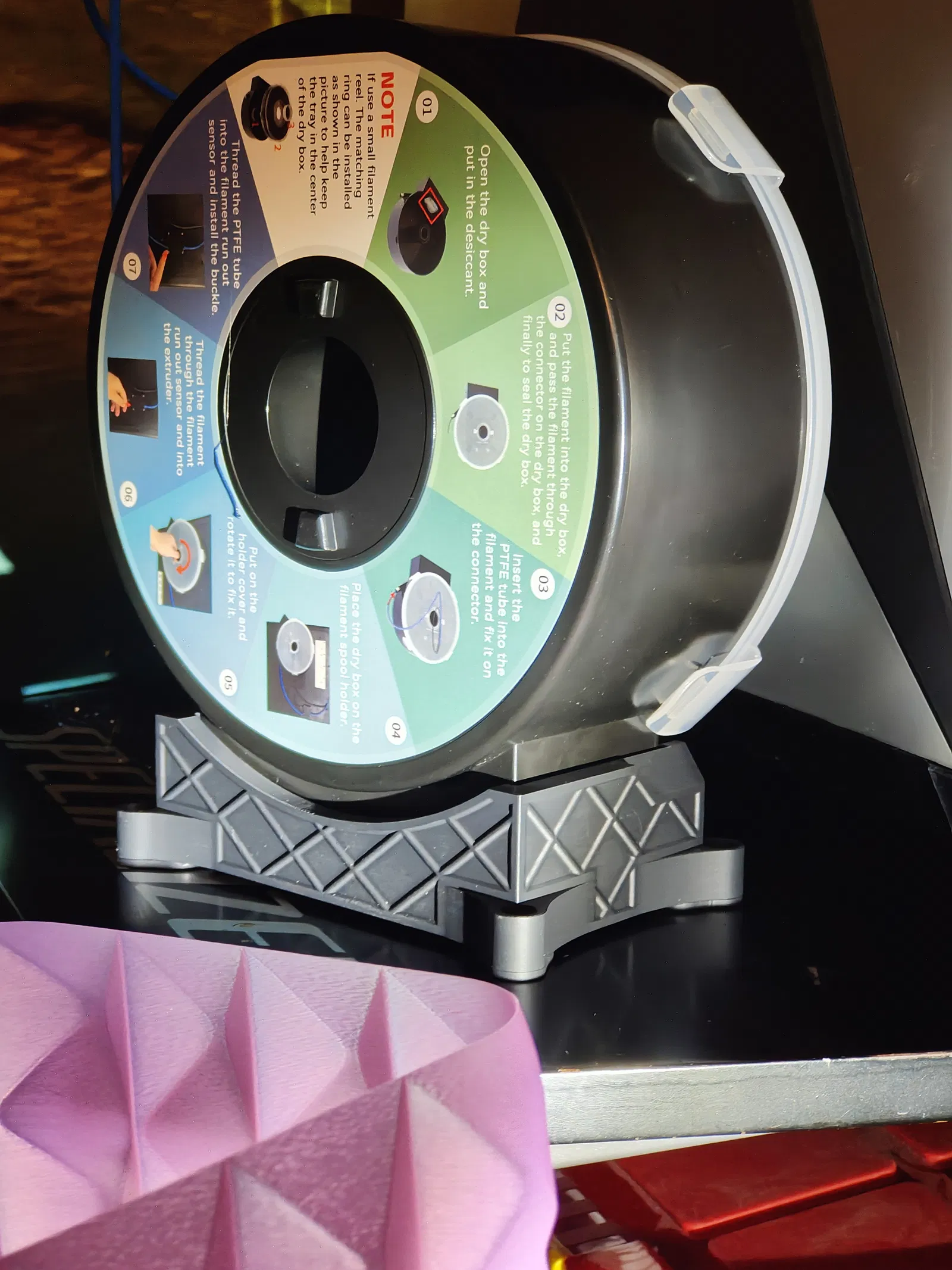 Đây là một cái đế nhỏ cho hộp đựng filament Qidi. Bạn có thể bắt vít nó vào bàn, hoặc đơn giản là đặt nó bên cạnh.