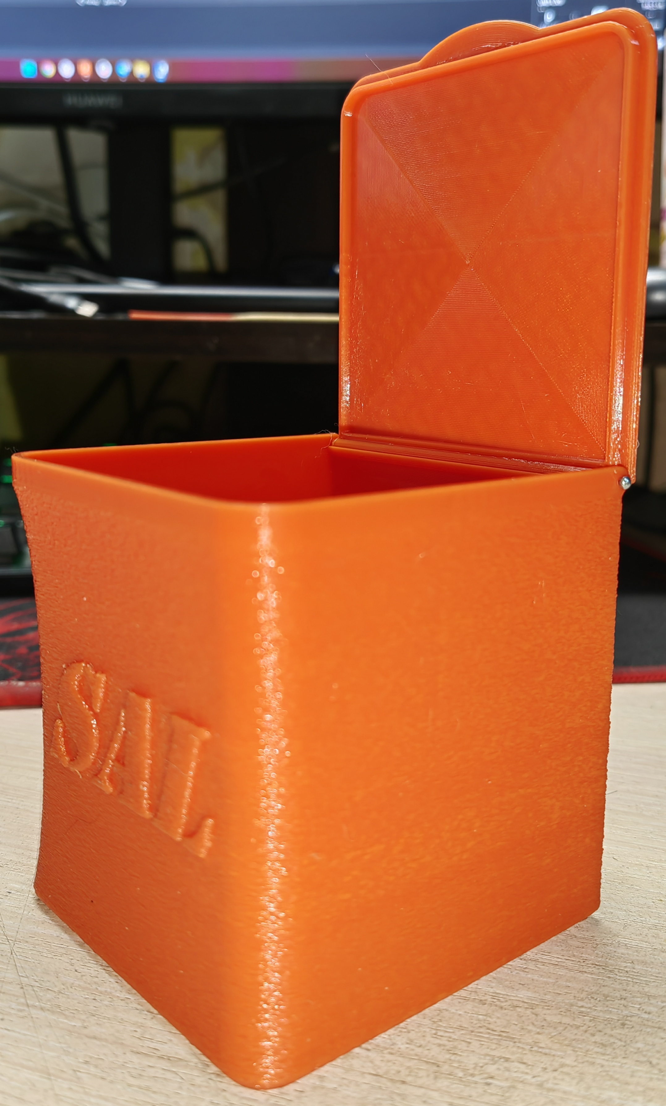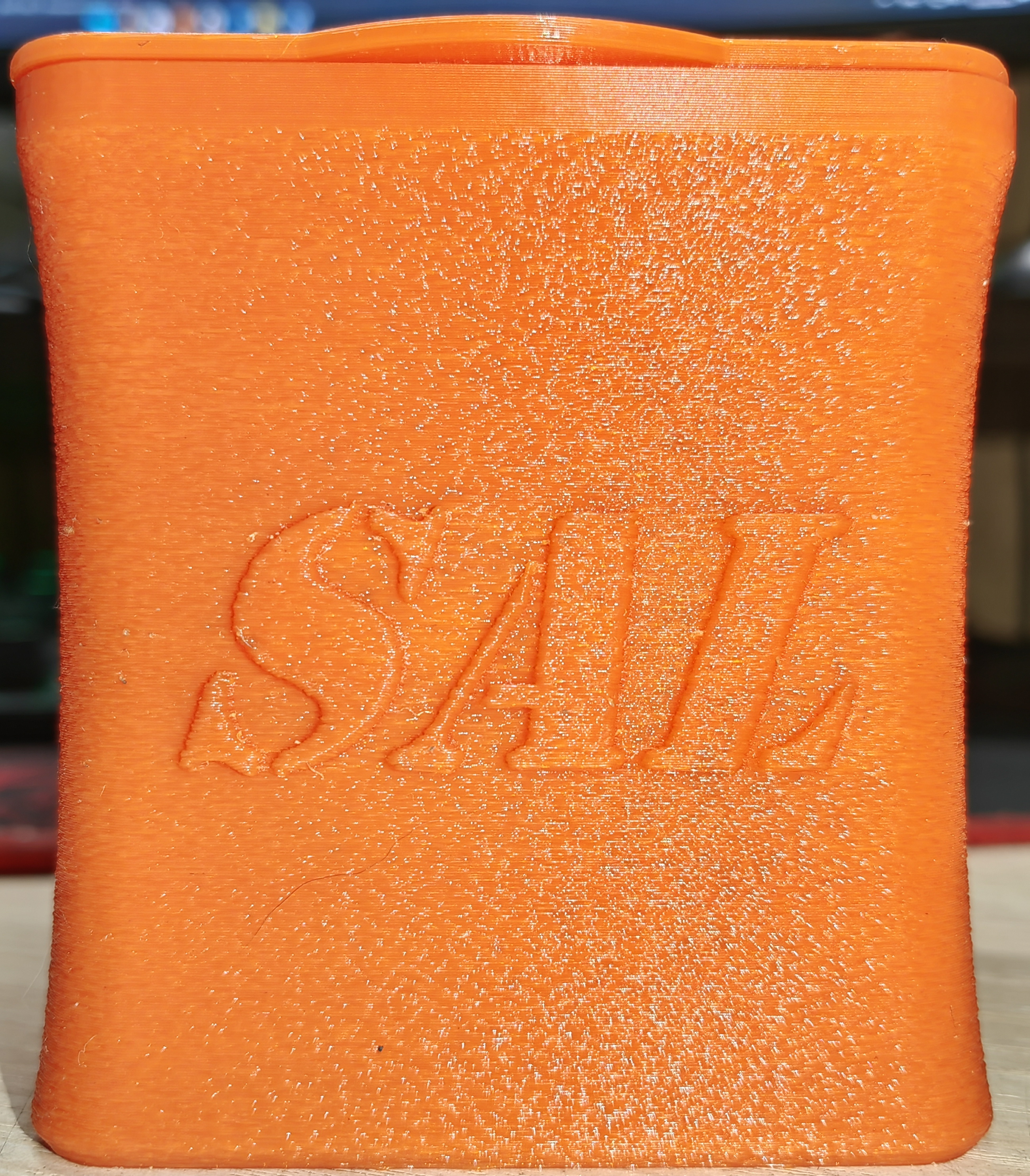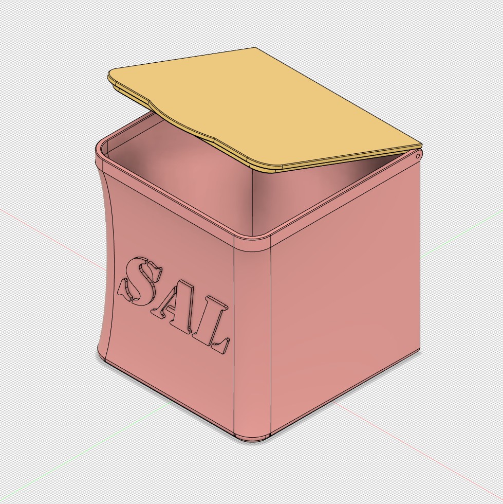 Hộp đựng muối này, với kích thước 80x80x87, được thiết kế để đựng muối trong nhà bếp của bạn. Bản in có các cài đặt lớp đầu tiên cụ thể và vỏ ngoài mờ. Nắp có hoa văn xoắn ốc và chốt bằng nhôm để đảm bảo chức năng.