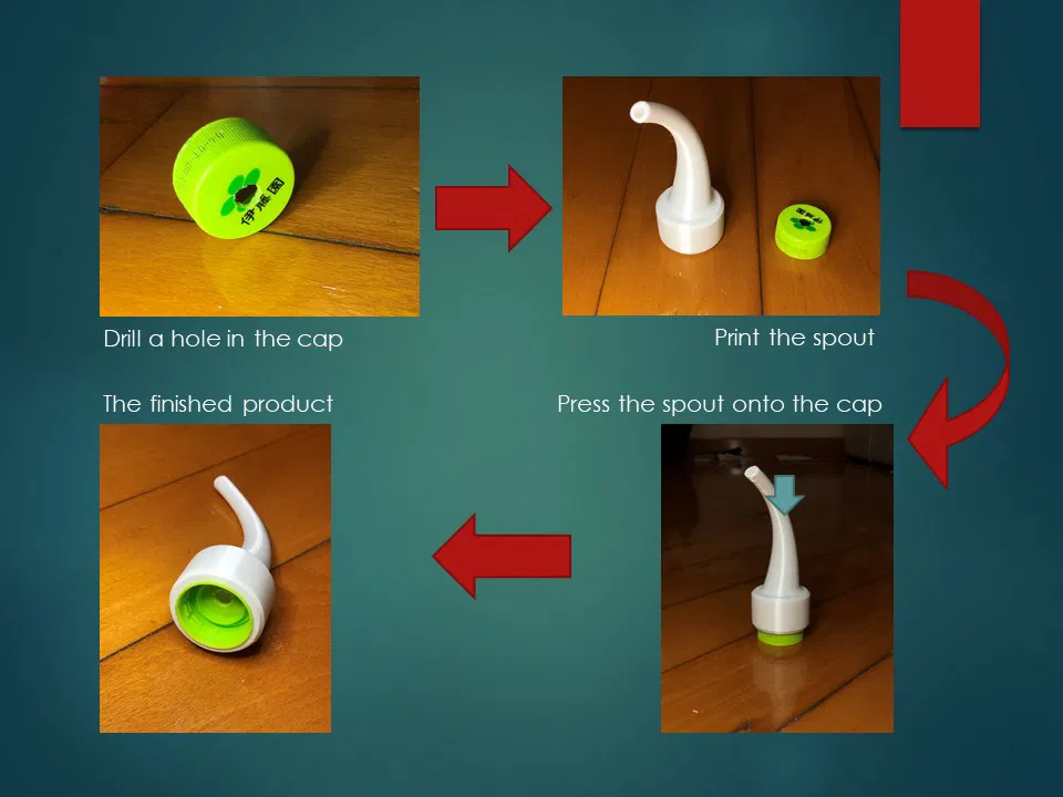Phụ kiện vòi gắn vào nắp chai nước uống thông thường, giúp bạn dễ dàng tưới cây. Thiết kế đơn giản, chỉ cần ép vào nắp chai đã khoét lỗ. Có thể tùy chỉnh độ khít bằng slicer. Phiên bản mới có ren xoáy trực tiếp vào chai, kèm ống chống rò rỉ.