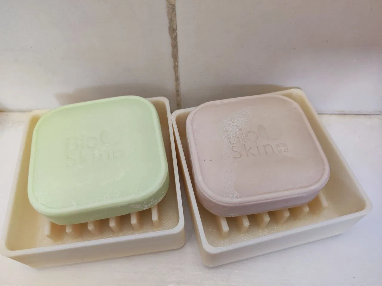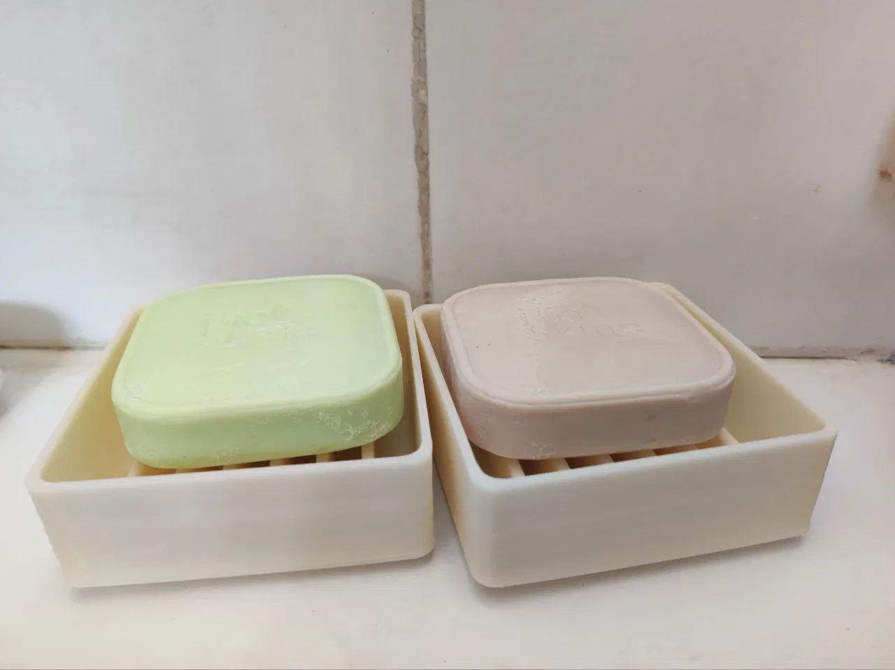 Một cái khay đựng xà bông vuông đơn giản, lòng trong 7.8 cm, không có lỗ thoát nước nên bên ngoài luôn sạch sẽ. Nên gắn thêm chân bằng keo nến, xà bông khô ráo nhờ có nhiều khoảng trống cho không khí lưu thông xung quanh.
