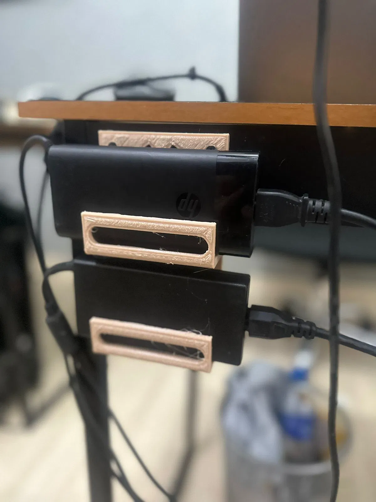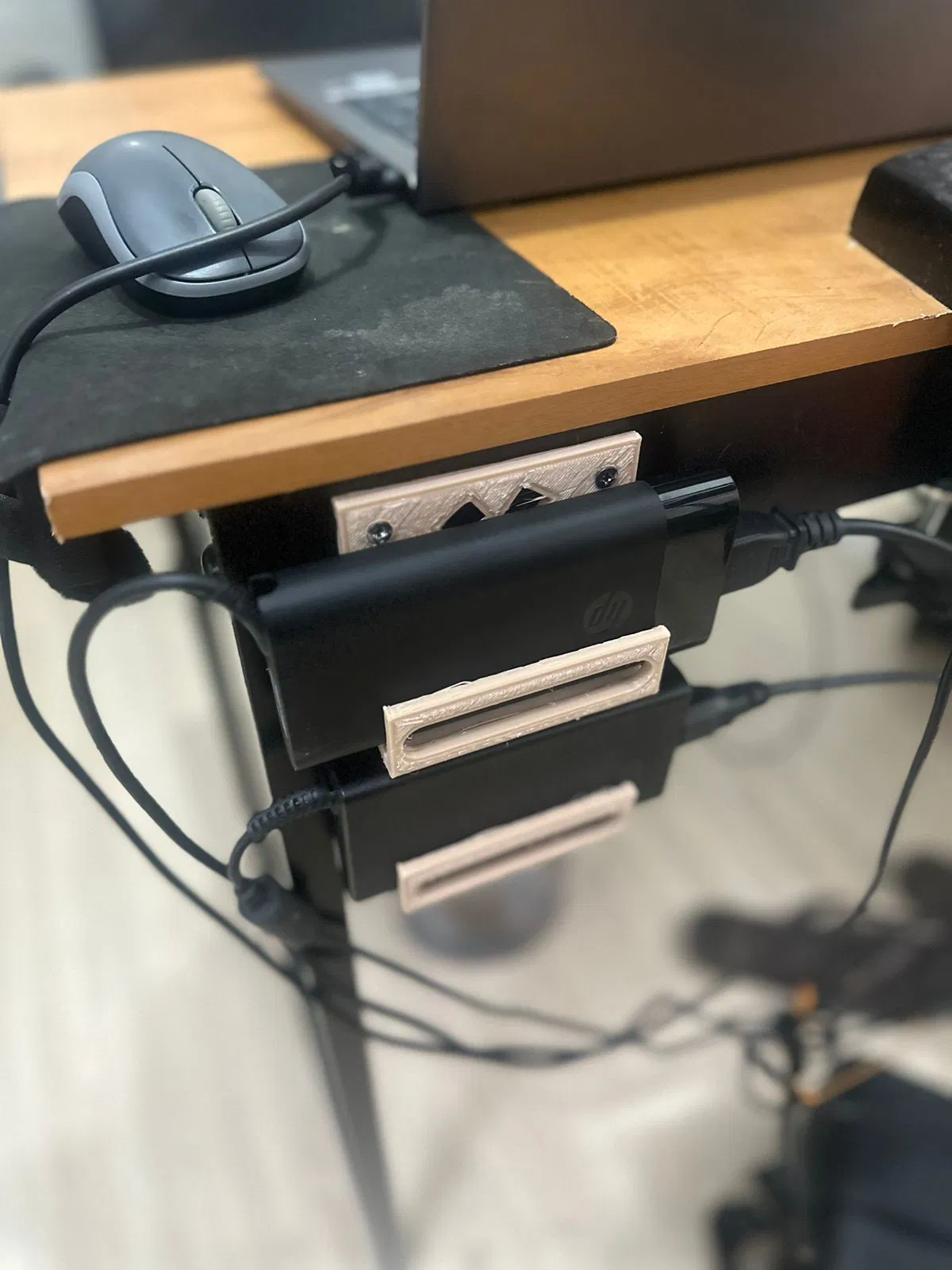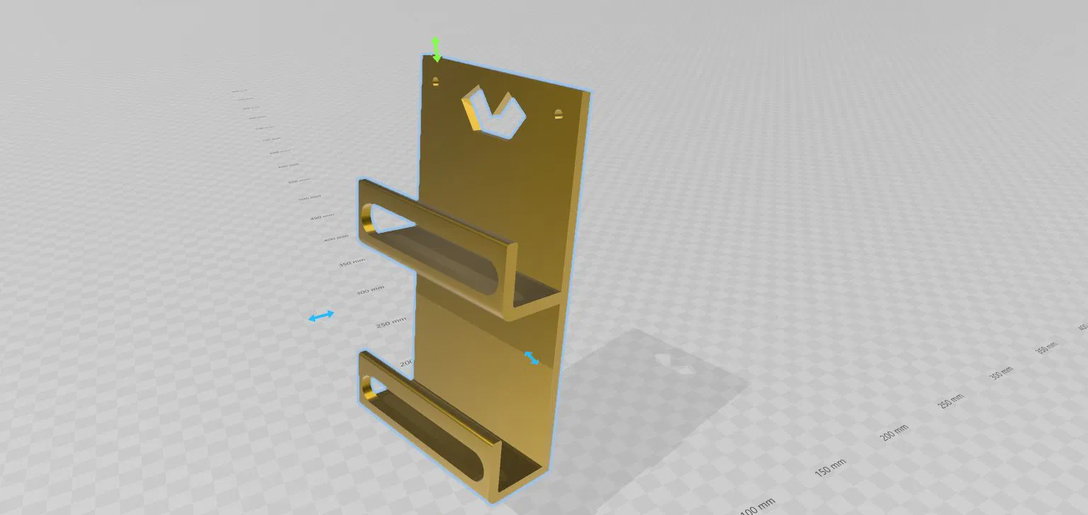 Tui tạo cái đế này để sắp xếp bàn làm việc cho gọn gàng hơn nè. Do tui có hai cục sạc laptop nên tui làm đế có hai chỗ để, có thêm hai lỗ bắt ốc M4 để gắn lên tường luôn.