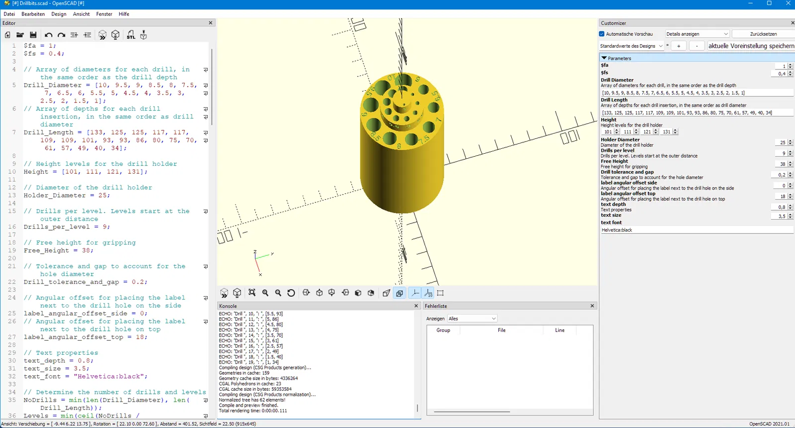 Remix hộp đựng mũi khoan hình trụ của Dagongar. Tui loại bỏ phần giữ mũi khoan bên trong và thiết kế lại phần này theo dạng parametric bằng OpenSCAD, cho phép bạn tùy chỉnh kích thước mũi khoan.