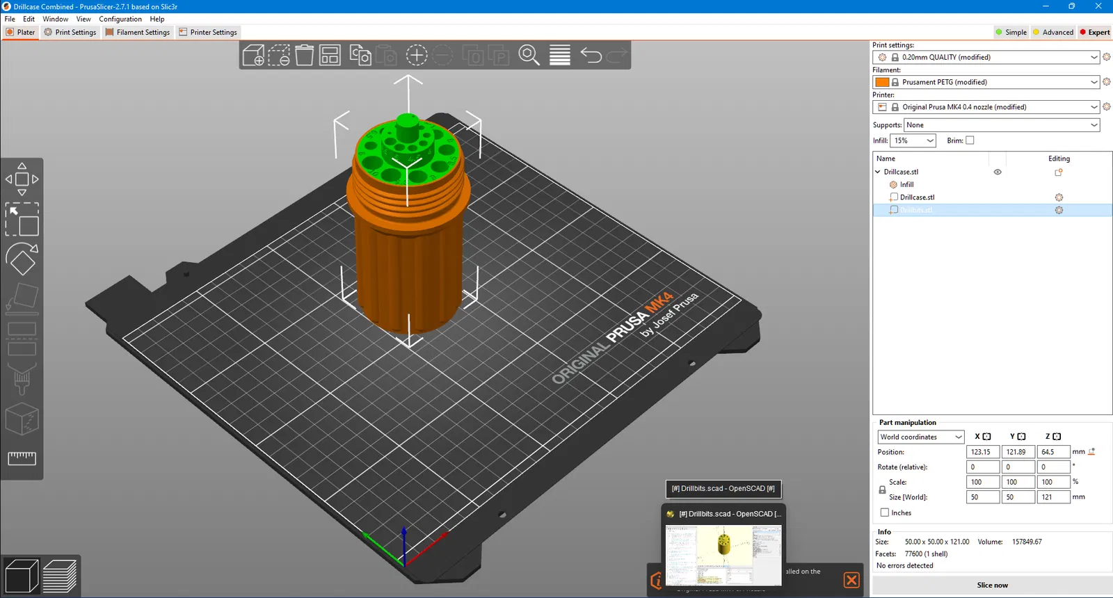 Bạn tự thiết kế đế giữ mũi khoan của bạn đi, xuất ra file Drillbits.STL. Tạo một project mới, import file Drillbits.stl, import file Drillcase.stl, rồi kết hợp cả hai lại và slice chung.