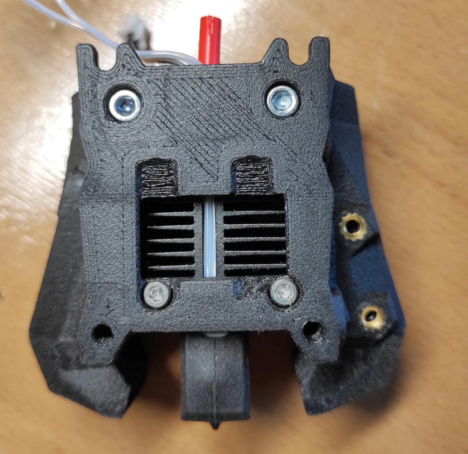 Bạn có thể cố định hotend bằng các lỗ thường dùng để bắt quạt (M2,5) hoặc bạn có thể dùng hai bu lông M3 ở phía trên. Tôi đã cố định hotend của mình bằng cả hai cách, vì có lý do gì mà không?