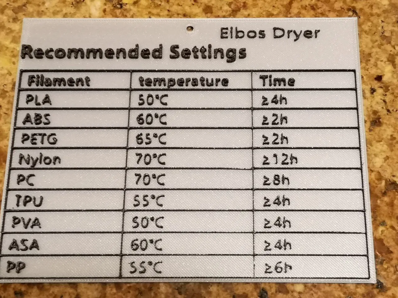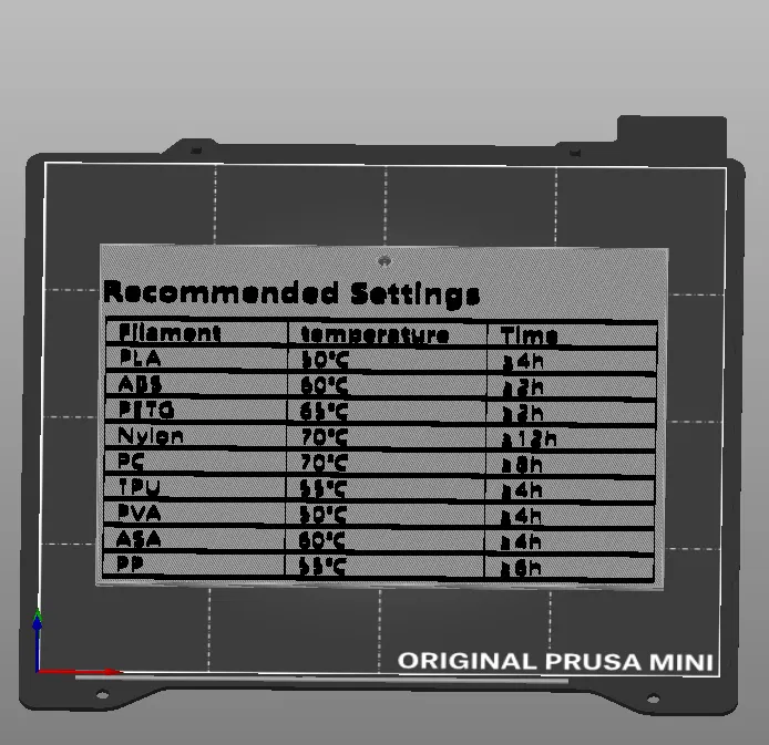 Tấm STL này là Hướng Dẫn Sấy Khô Filament cho in 3D, đưa ra nhiệt độ và thời gian khuyên dùng cho các loại vật liệu khác nhau. Giúp bạn bảo quản filament tốt hơn cho kết quả in đẹp nhất.