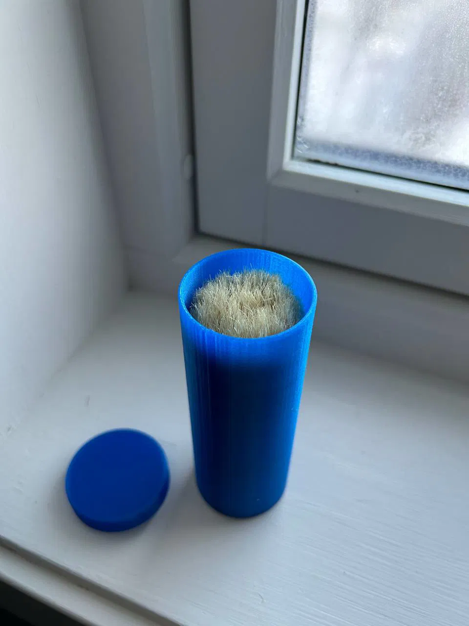 Cái hộp đựng cọ cạo râu NOM Carl. Thiết kế có nắp ép vừa, có thể điều chỉnh độ khít bằng cách thu nhỏ kích thước nắp 1-2% nếu cần. Đáy hộp có lỗ thông gió.