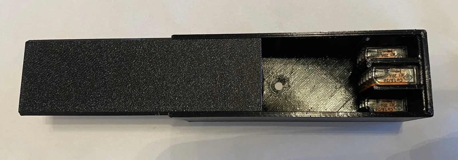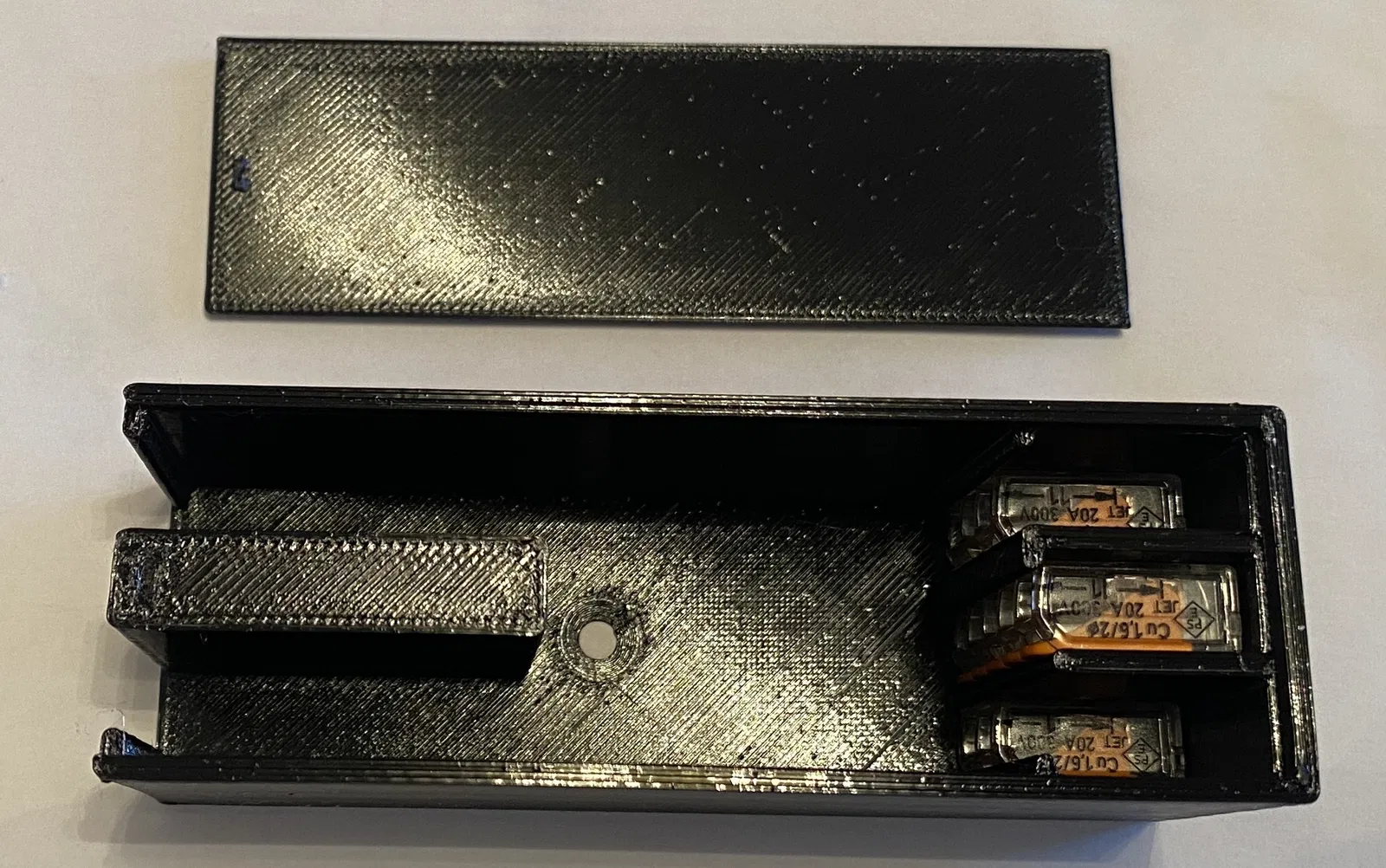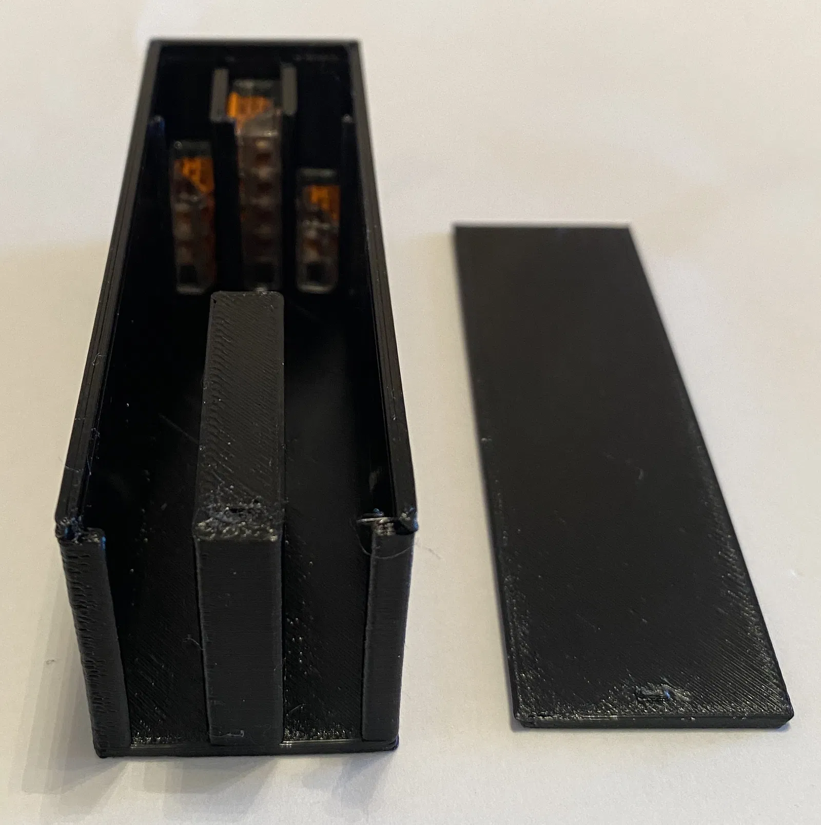 Nắp hộp có rãnh đuôi én với một cái lẫy khít nằm ở phía trước. Độ dung sai đủ để trượt vào mà không hề khó khăn.