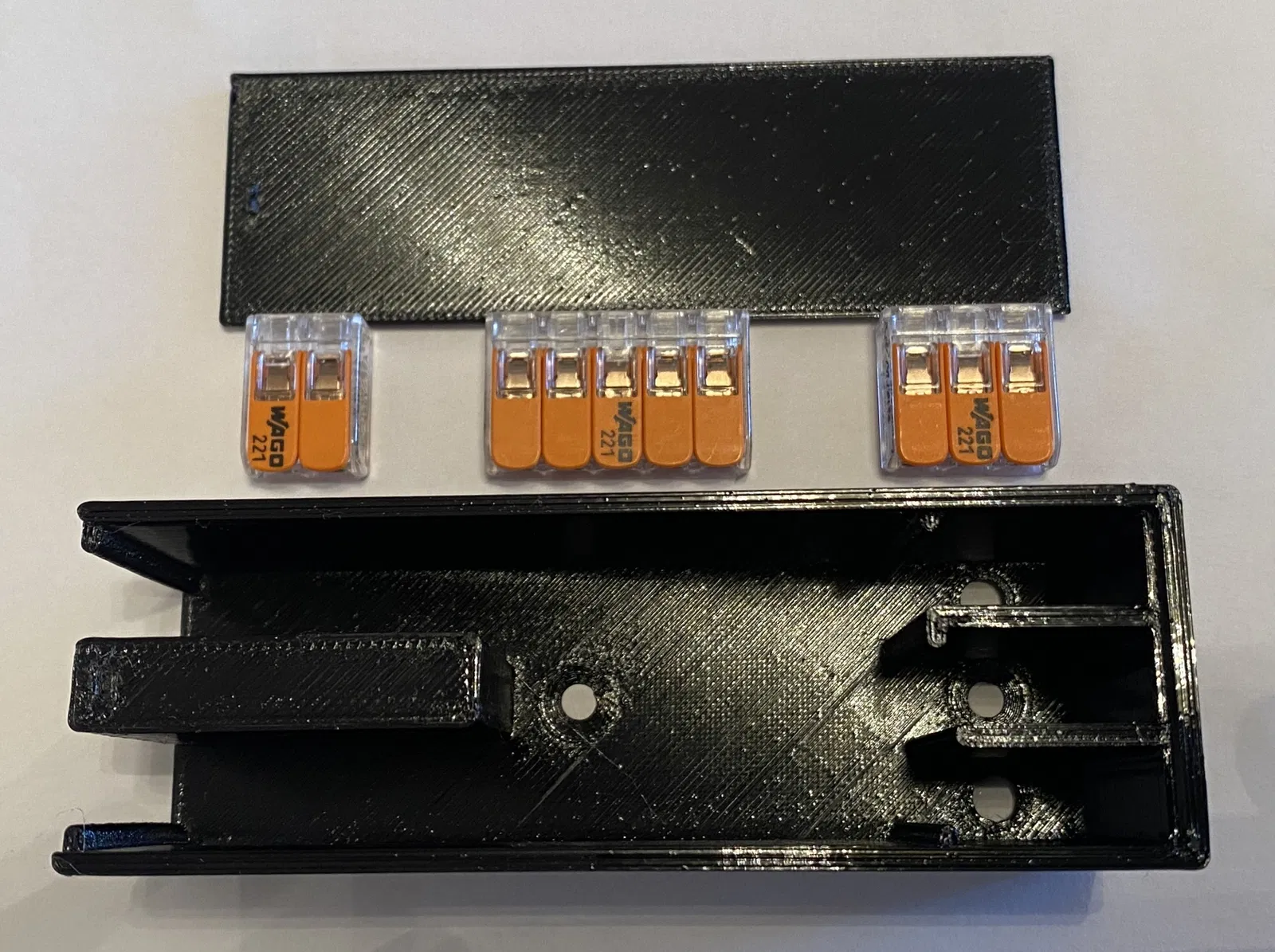 Hộp nối Wago 221 nhỏ gọn, có 3 ngăn cho mọi phiên bản Wago 221. Ngăn khít, dễ tháo lắp. Có rãnh luồn dây. Nên in bằng PETG thay vì PLA để chịu nhiệt tốt hơn. Đã thử nghiệm trên Prusa Mini+.