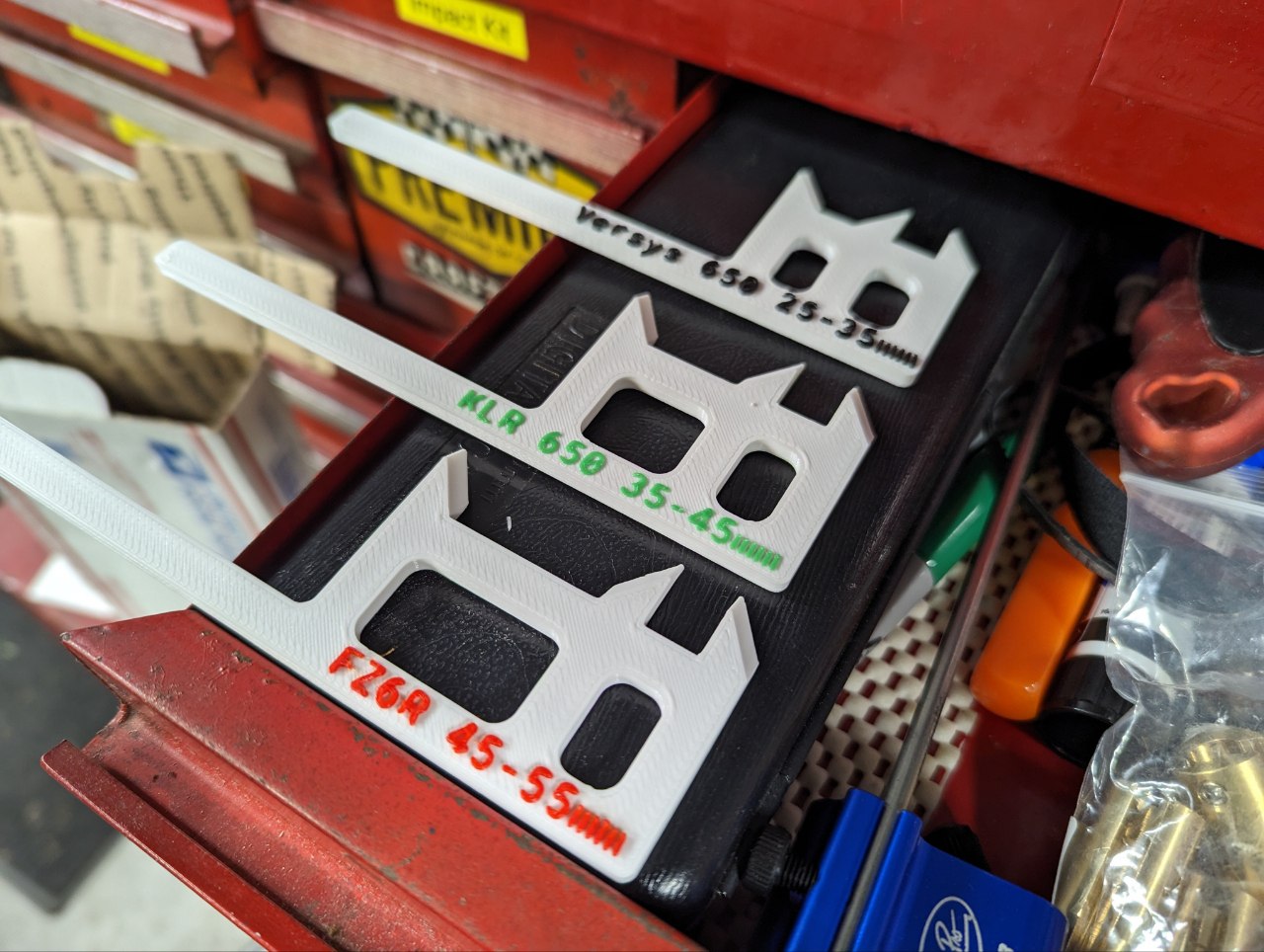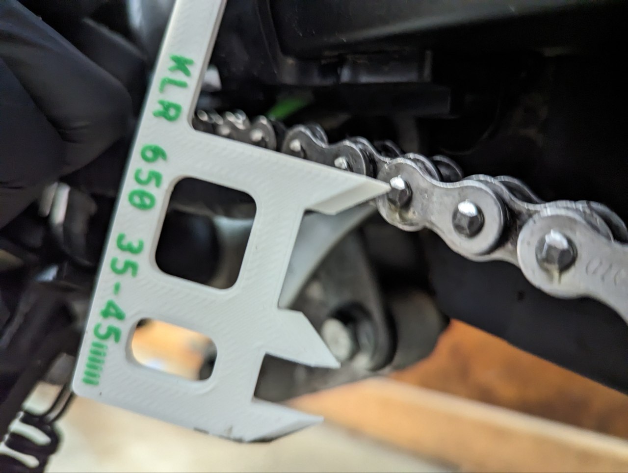 Thước căn chỉnh độ chùng xích xe máy kiểu kẹp cho Kawasaki KLR650, Versys 650, Ninja 650 và các xe khác. Giúp việc kiểm tra và chỉnh độ chùng xích dễ dàng hơn.