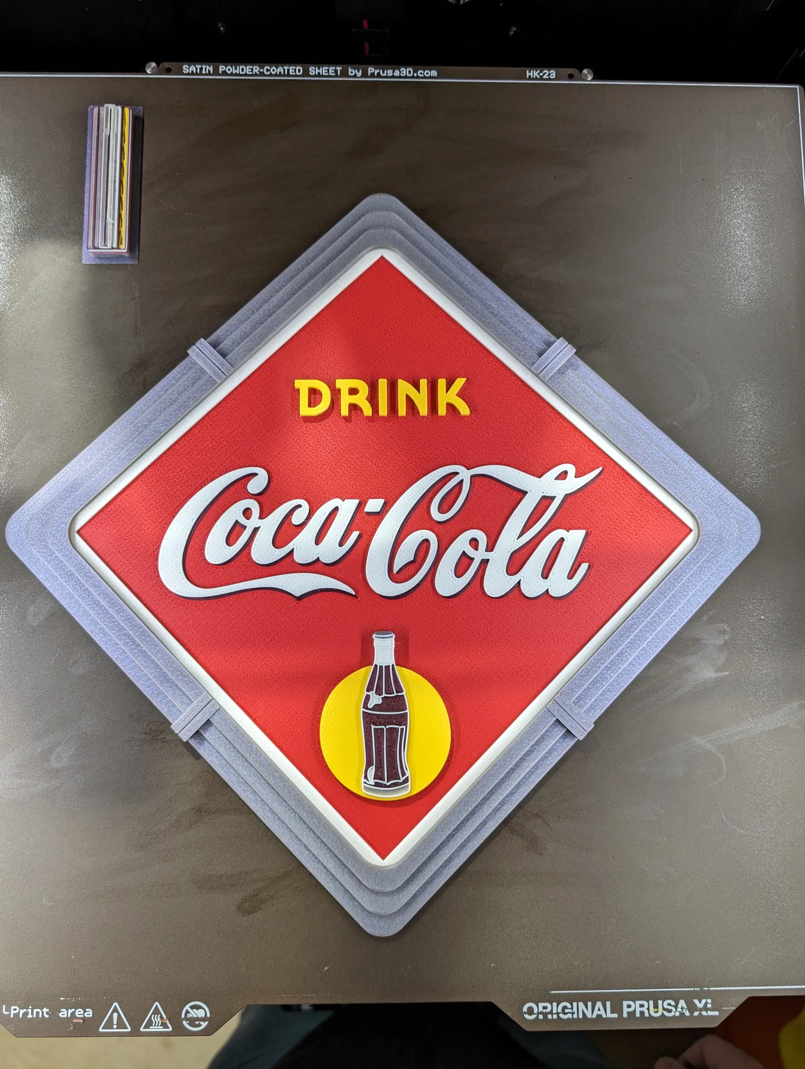 Biển hiệu Coca-Cola theo phong cách Art Deco, lấy cảm hứng từ một tấm biển thật. Bản in trong ảnh được in ở độ cao lớp 0.15 mm, họa tiết Hilbert Curve và năm màu.
