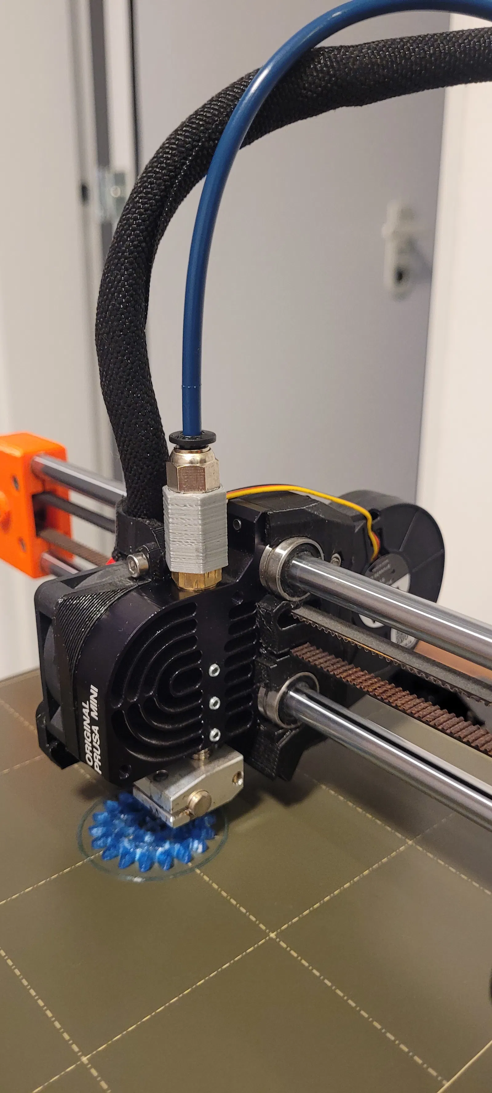 Adapter này cho phép tái sử dụng khớp nối gốc của Prusa (xem PDF) bằng cách khoan lỗ 4mm để luồn ống PTFE qua.