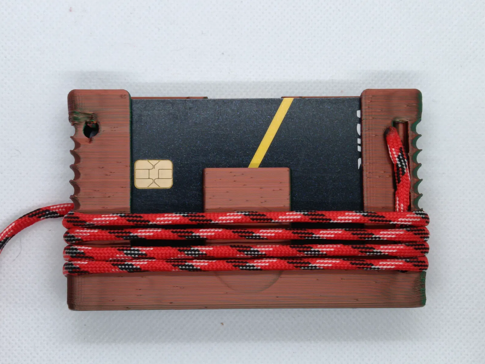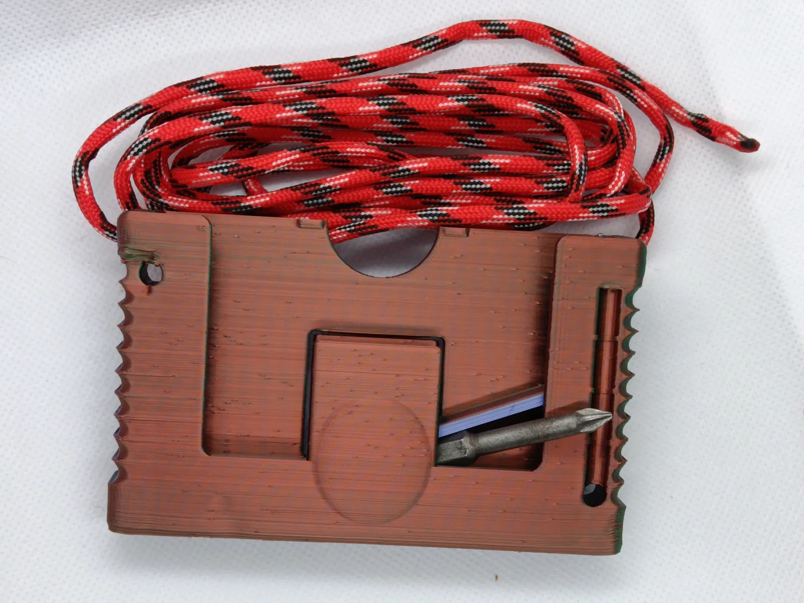 Túi đựng thẻ bằng dây dù có ngăn bí mật. Mỗi người có ý tưởng riêng về một chiếc ví đựng thẻ ưng ý, đây là của tôi. Các góc bo tròn đẹp mắt, đựng được 10 thẻ, chắc chắn. Nó có thể chứa hơn 2 mét dây dù quấn bên ngoài, được giữ chắc chắn bằng các rãnh nông nên không có nút thắt cộm trong túi. Ẩn ở một góc là một lỗ để gài một chiếc kim may thông thường, một vật dụng cực kỳ tiện dụng để móc mọi thứ ra khỏi các khe nứt và cũng để loại bỏ mảnh vụn khi bạn không dùng nó để ghim đồ.