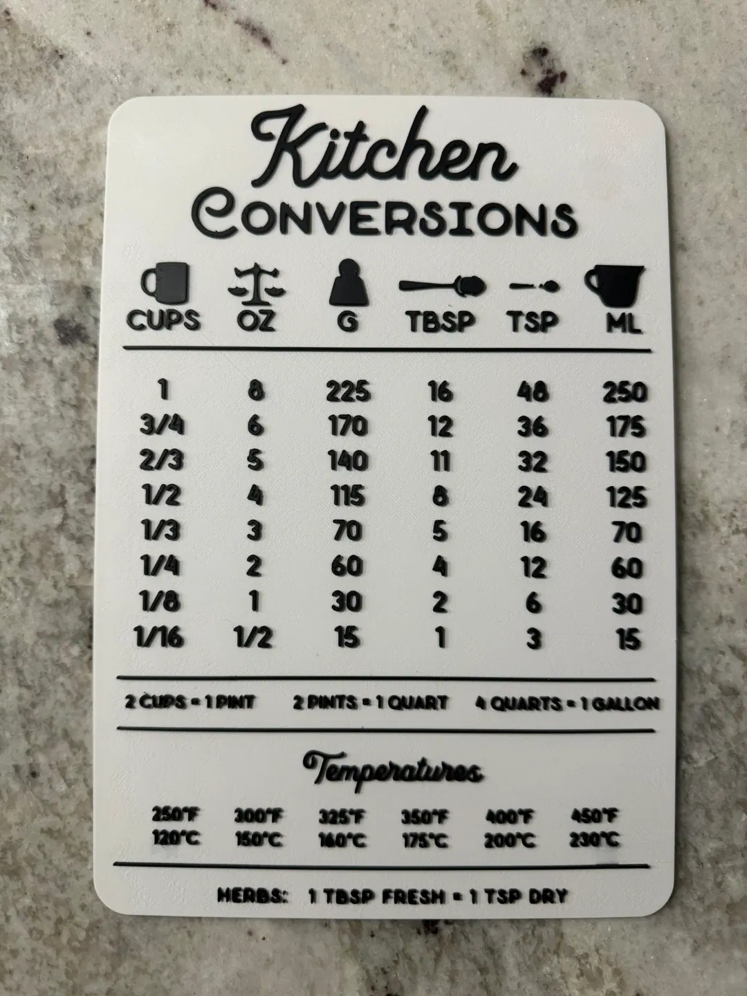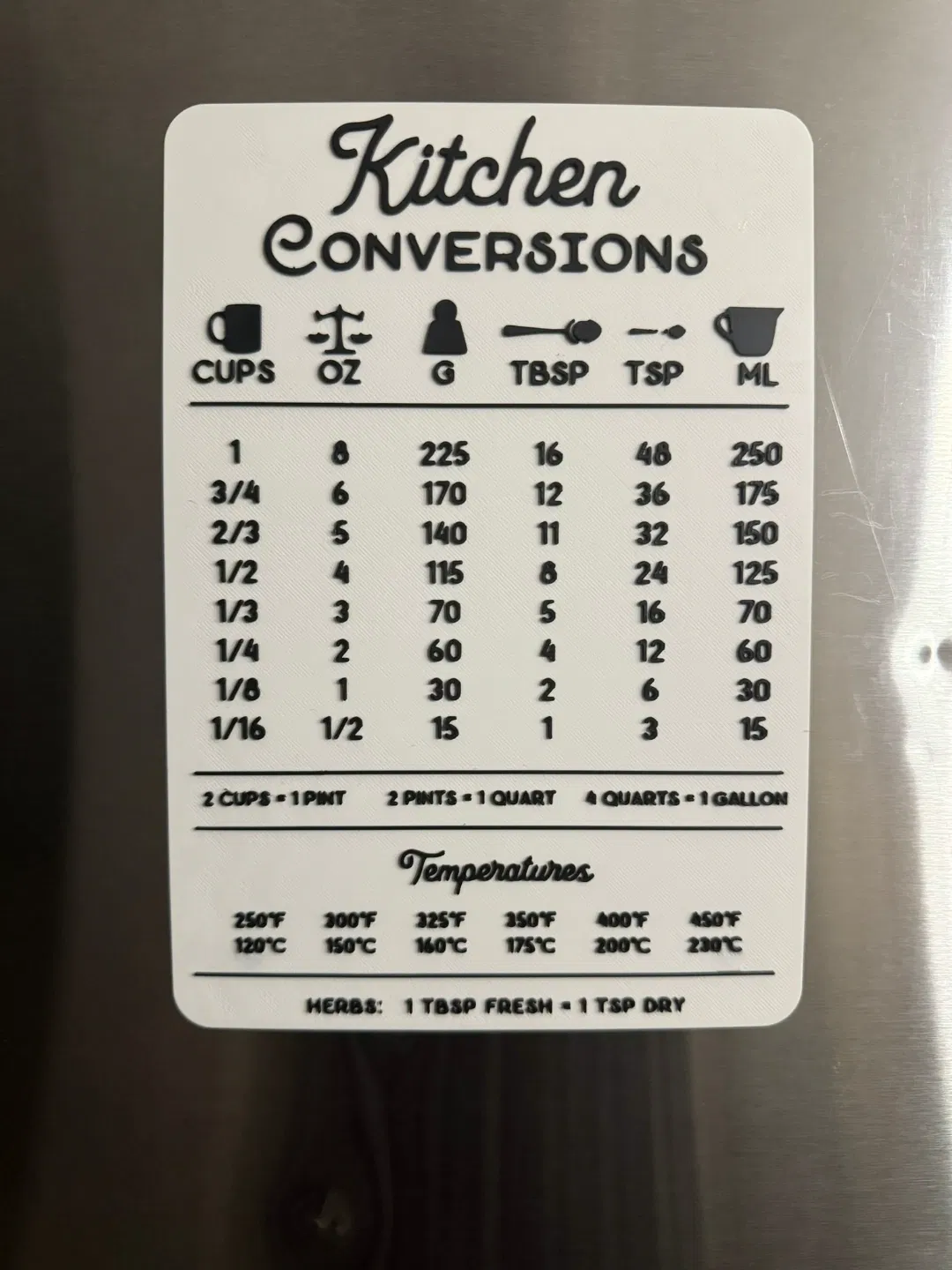 Một bảng chuyển đổi nhà bếp đơn giản với tất cả thông tin cần thiết để dán lên tủ lạnh.