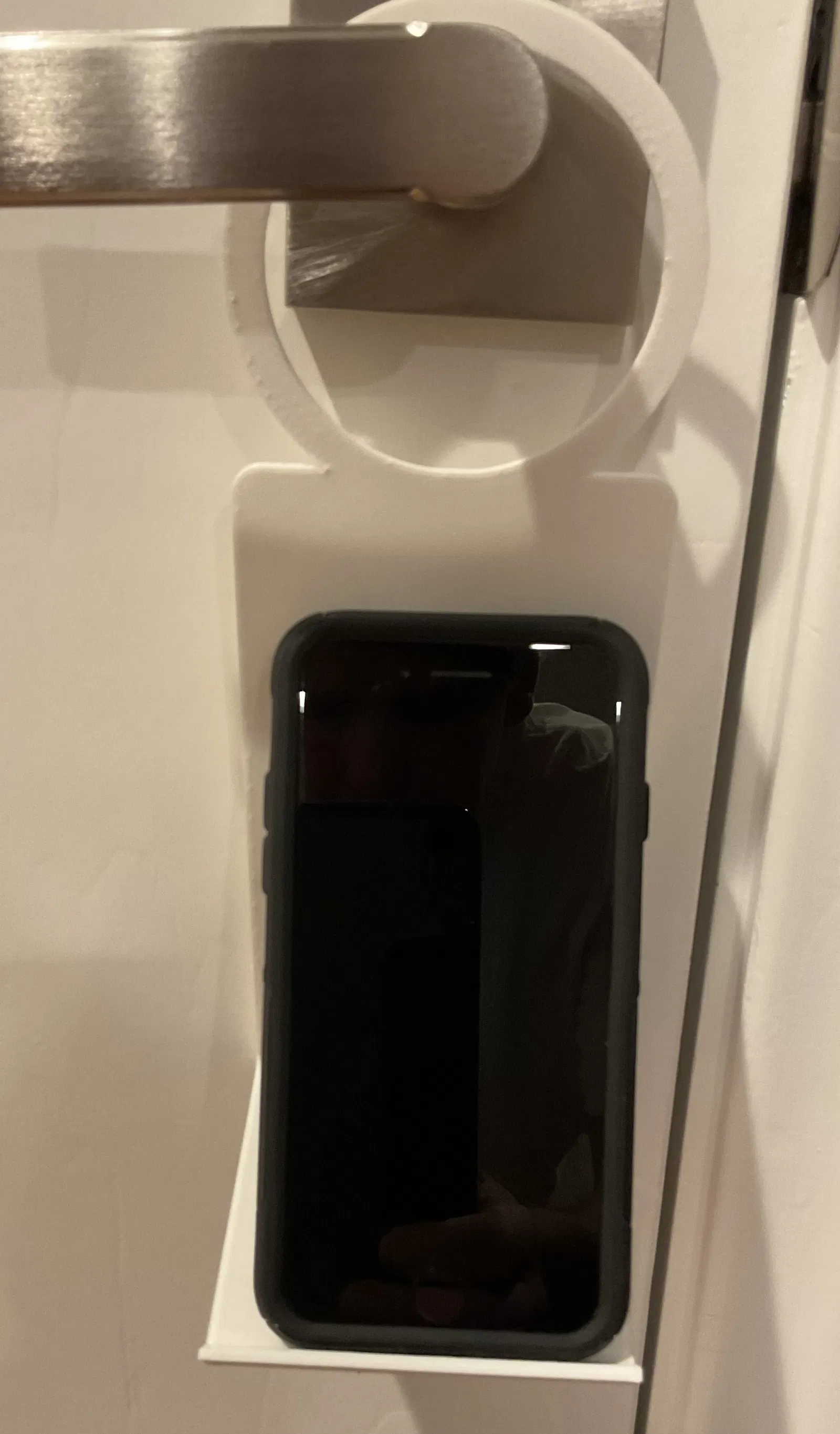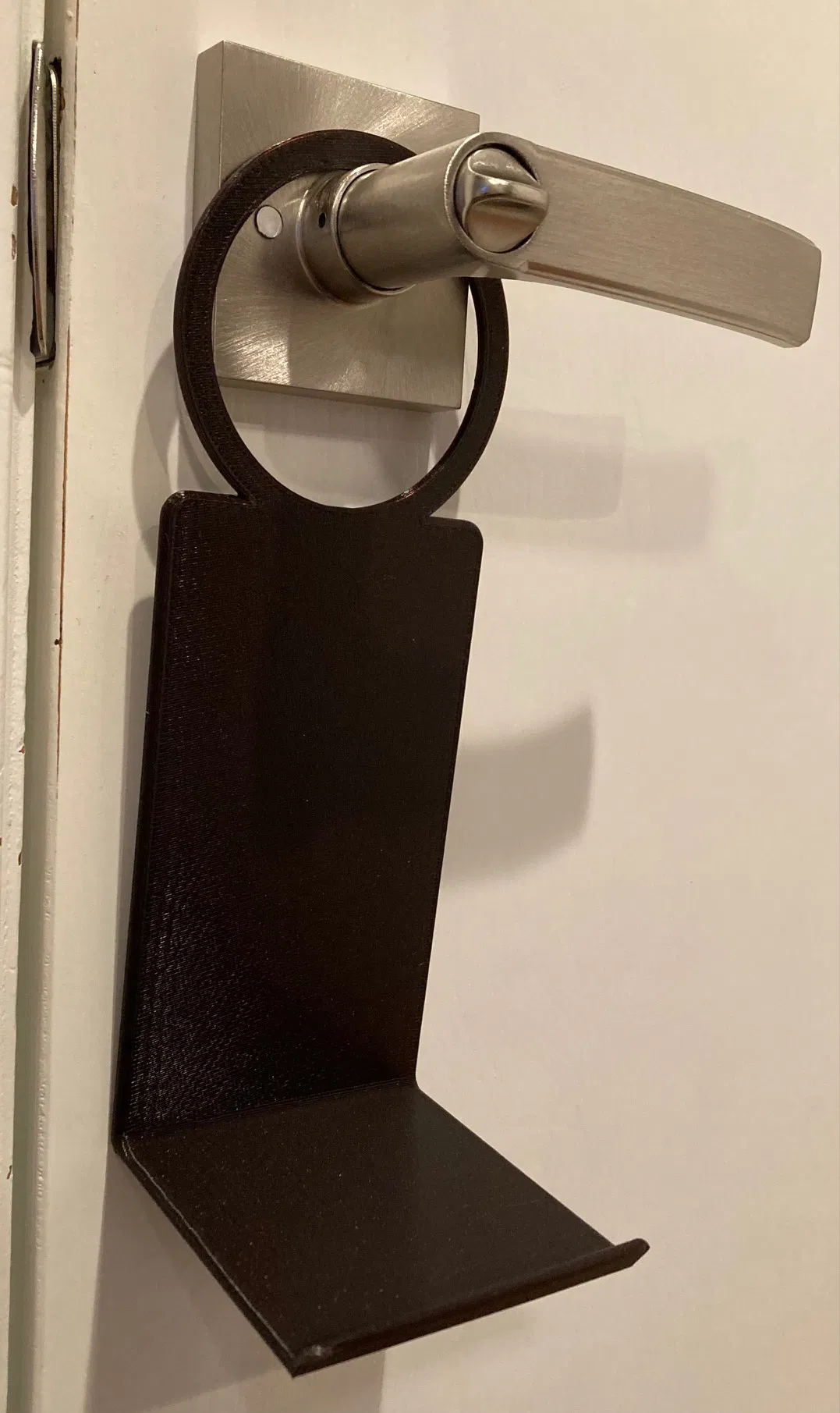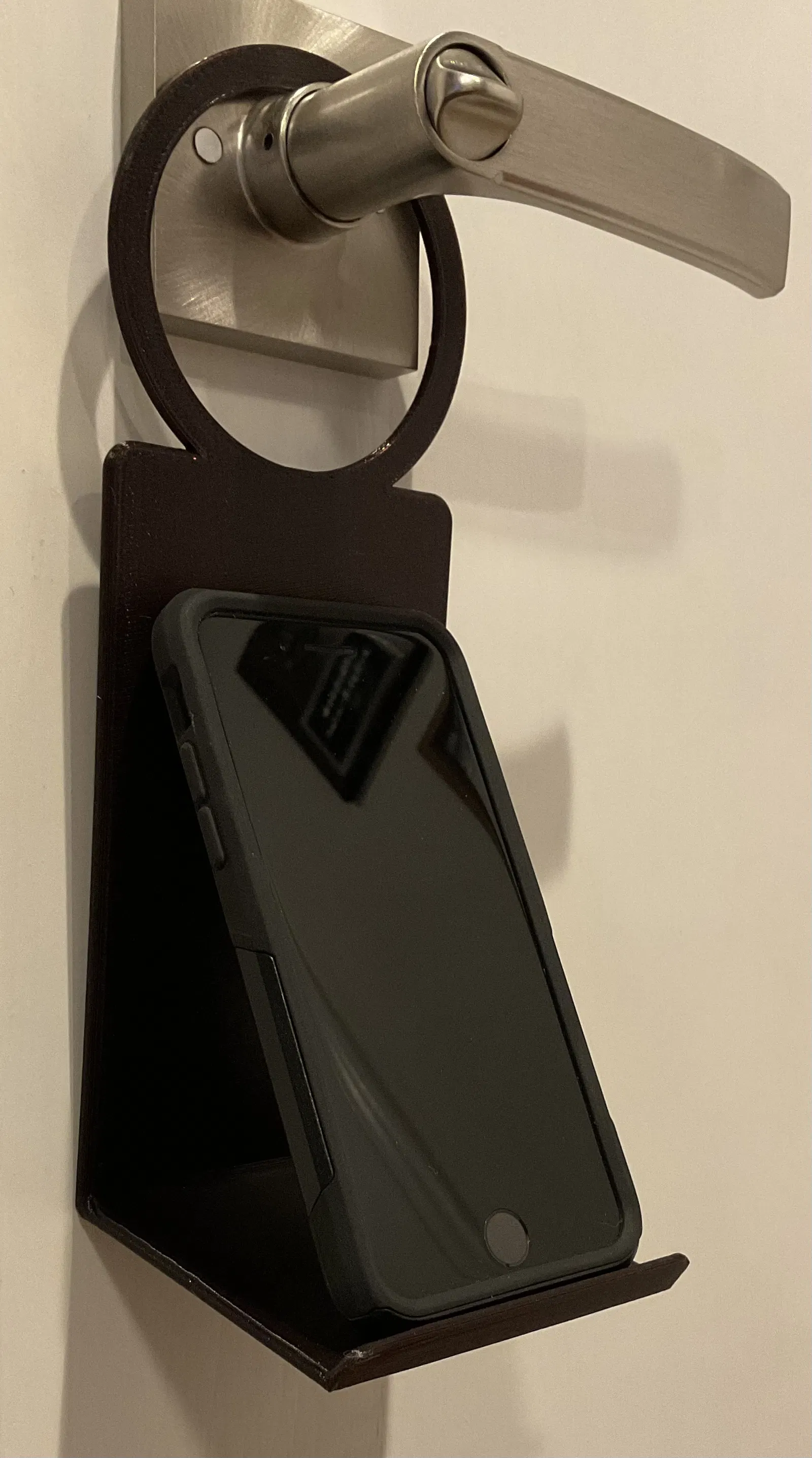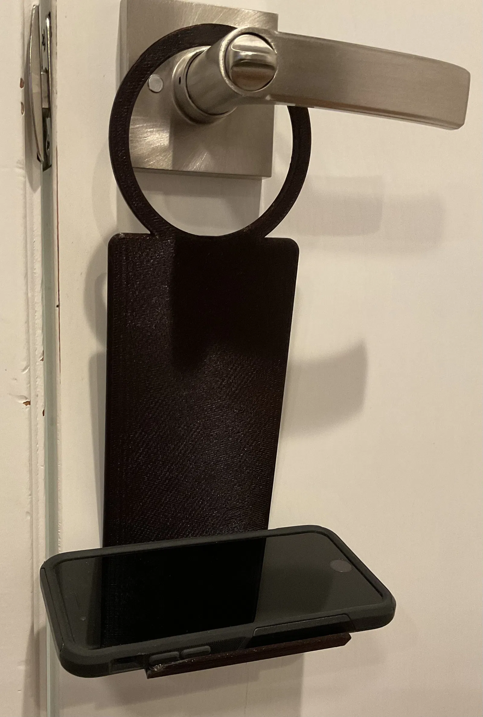 Một cái kệ gắn tay nắm cửa để đựng điện thoại hay bất cứ thứ gì bạn cần. In với mặt có lỗ úp xuống bàn in. Không cần support.