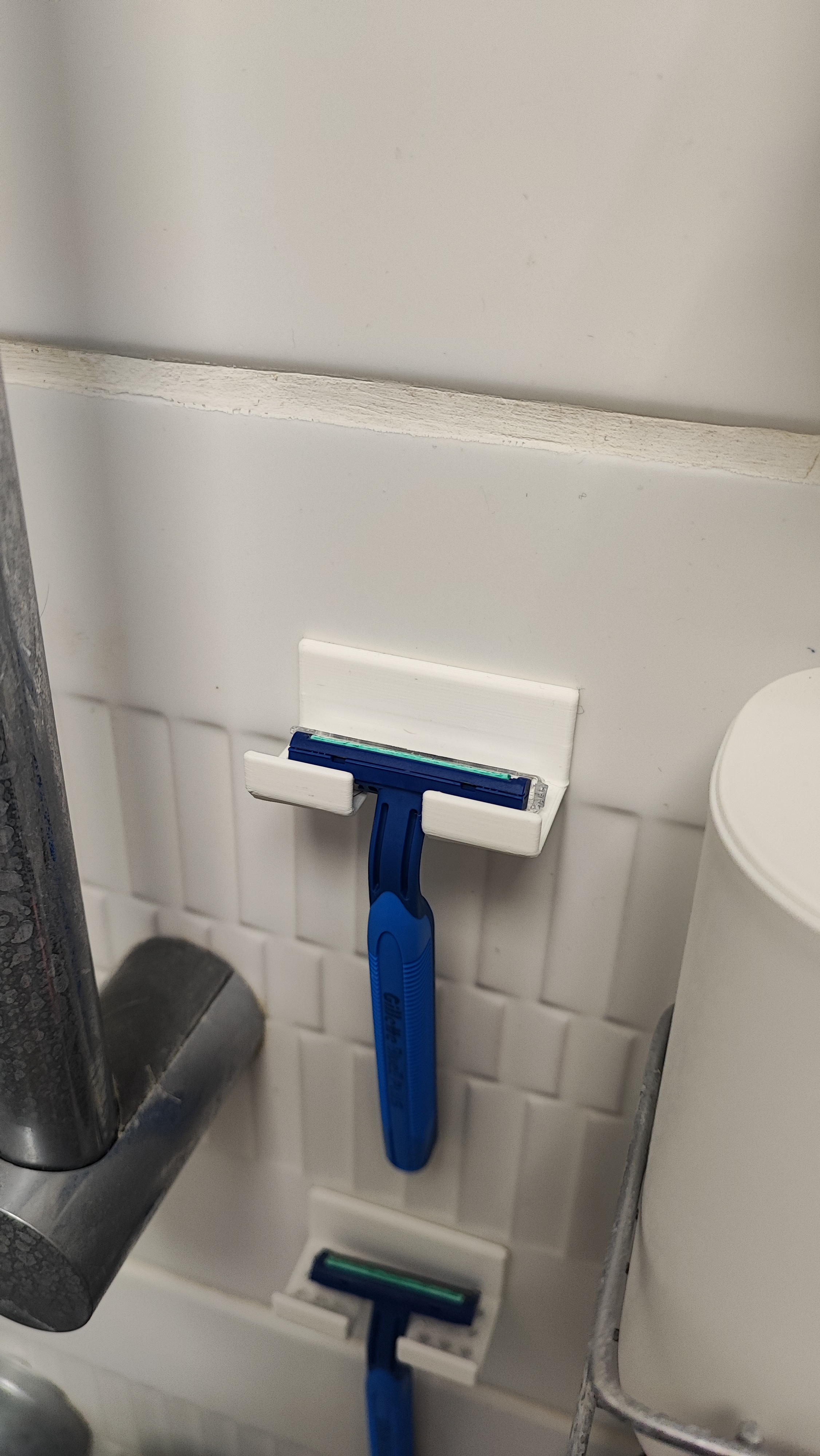 Móc treo dao cạo râu dùng một lần, giải pháp cho vấn đề thiếu không gian và chỗ cất dao cạo. Thiết kế có lỗ thoát nước, giúp dao cạo khô ráo.