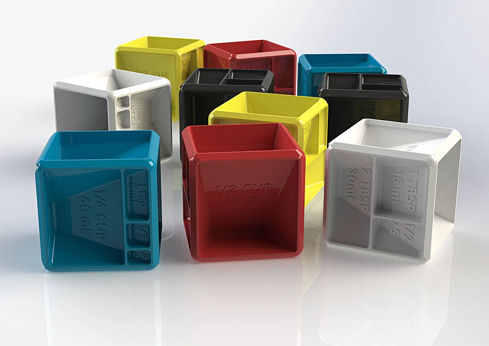 1 cup (236.588 mL), 1/2 cup, 1/3 cup, 1/4 cup, 1/8 cup, 1/4 teaspoon, 1/2 teaspoon, 1 teaspoon (4.928 mL), 1/2 tablespoon, 1 tablespoon. Kích thước: Khối lập phương 89 mm (3.5 inch).
