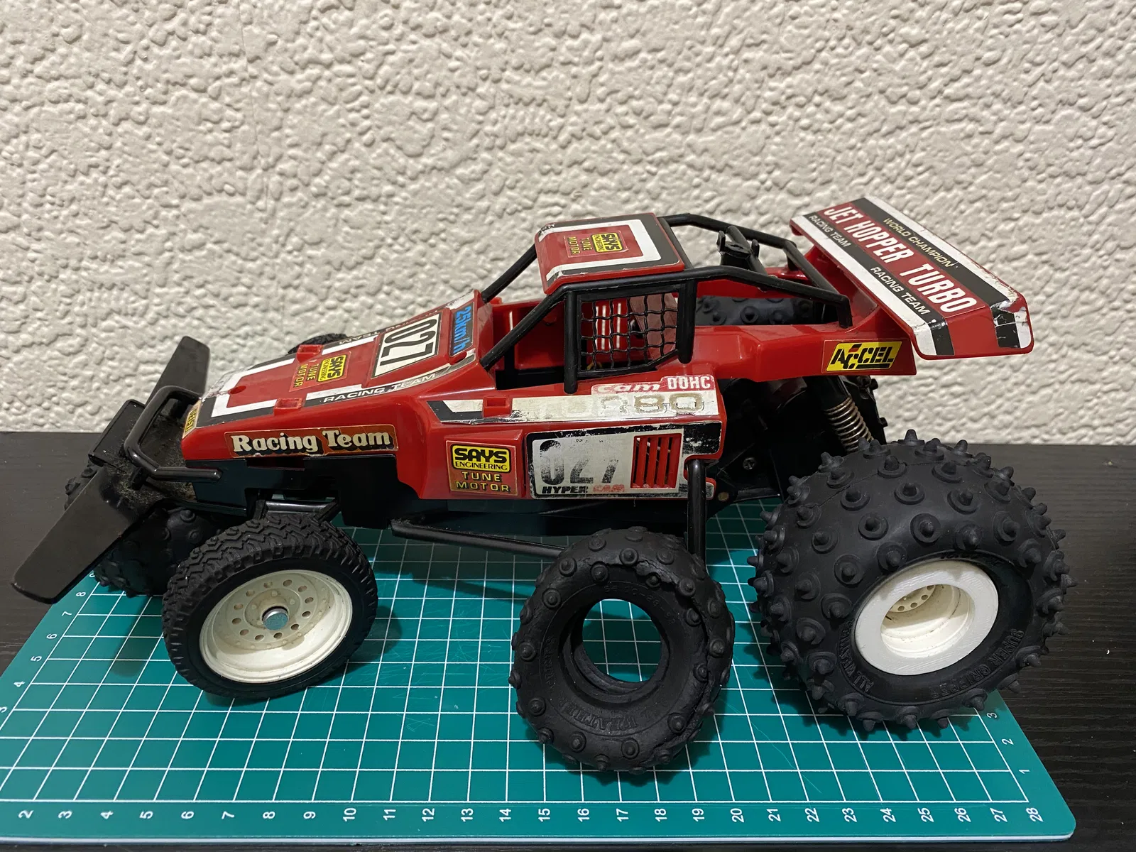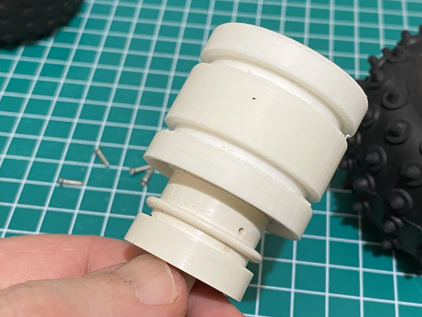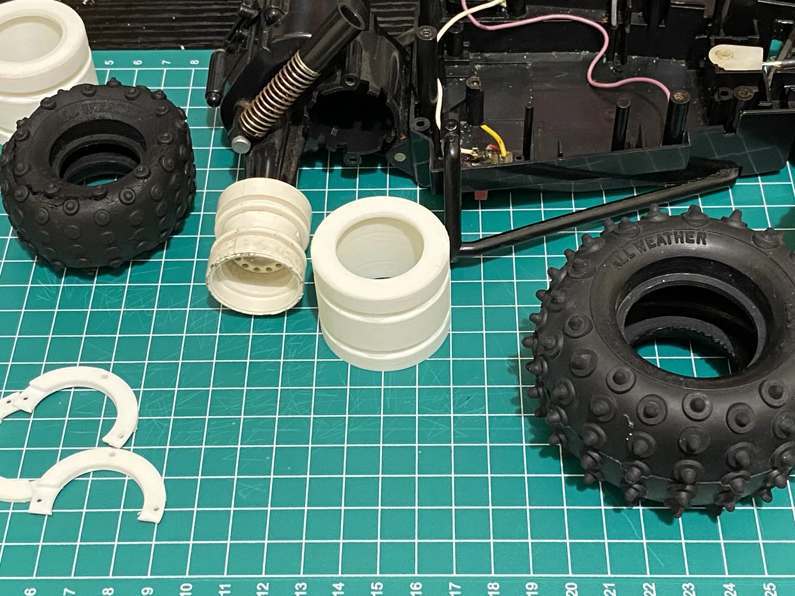 Tui đang cố gắng sửa lại chiếc Jet Hopper đời 1980. Một trong những vấn đề của mấy chiếc xe R/C cũ này là lốp sau bị hư và khó tìm đồ thay thế. Có mấy loại lốp lớn hơn và cái ống lót này có thể dùng để gắn lốp Hornet lớn hơn vào Jet Hopper cũ.