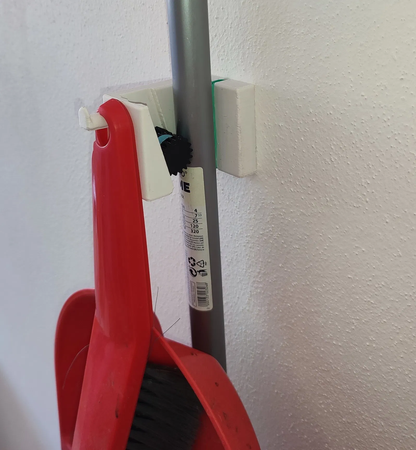 Để chứa chổi và một cái hốt rác, giải pháp của tôi là xoay giá đỡ chổi và thêm một cái móc.