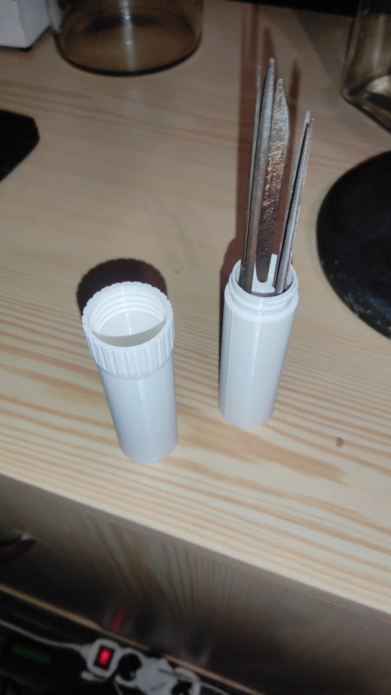 Hộp đựng dũa kim. Đường kính lỗ là 4mm. Ở phần đáy, sau khi in xong cần phải chọc thủng một lớp mỏng 0,1mm. Hai phần được nối với nhau bằng ren của chai PET. In không cần support, trên máy Prusa mini.