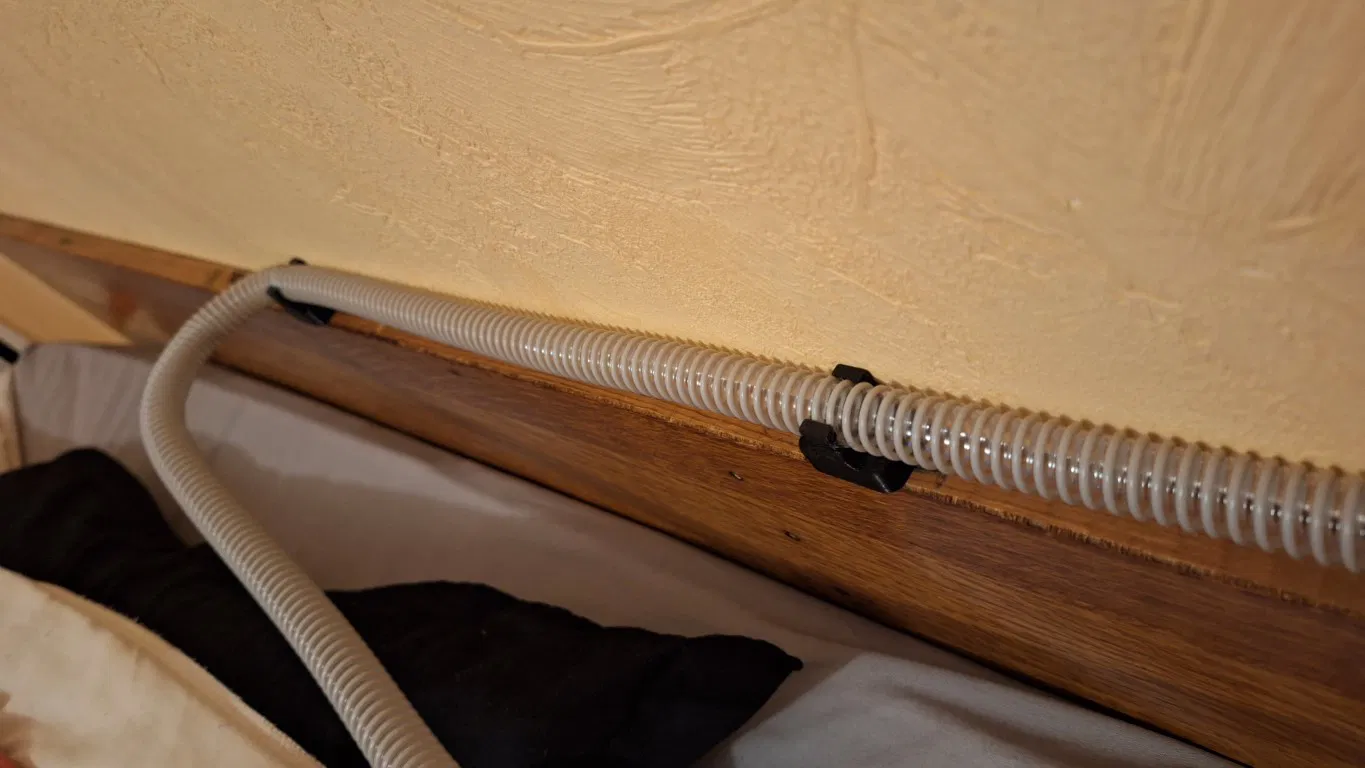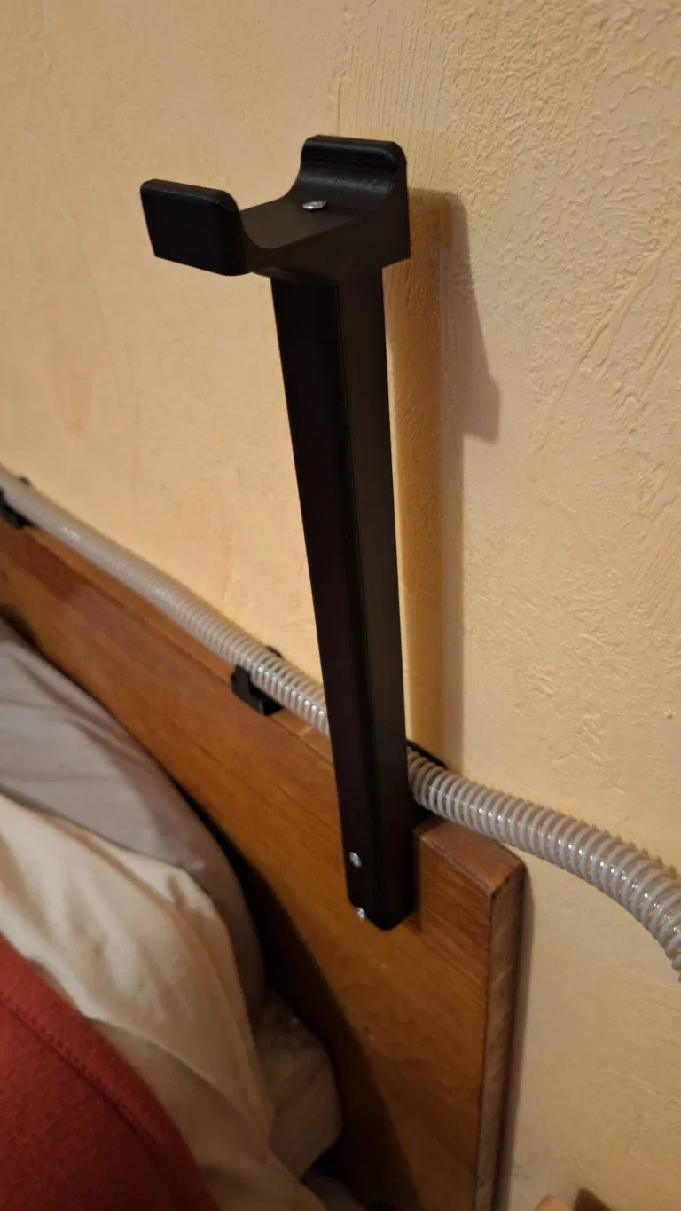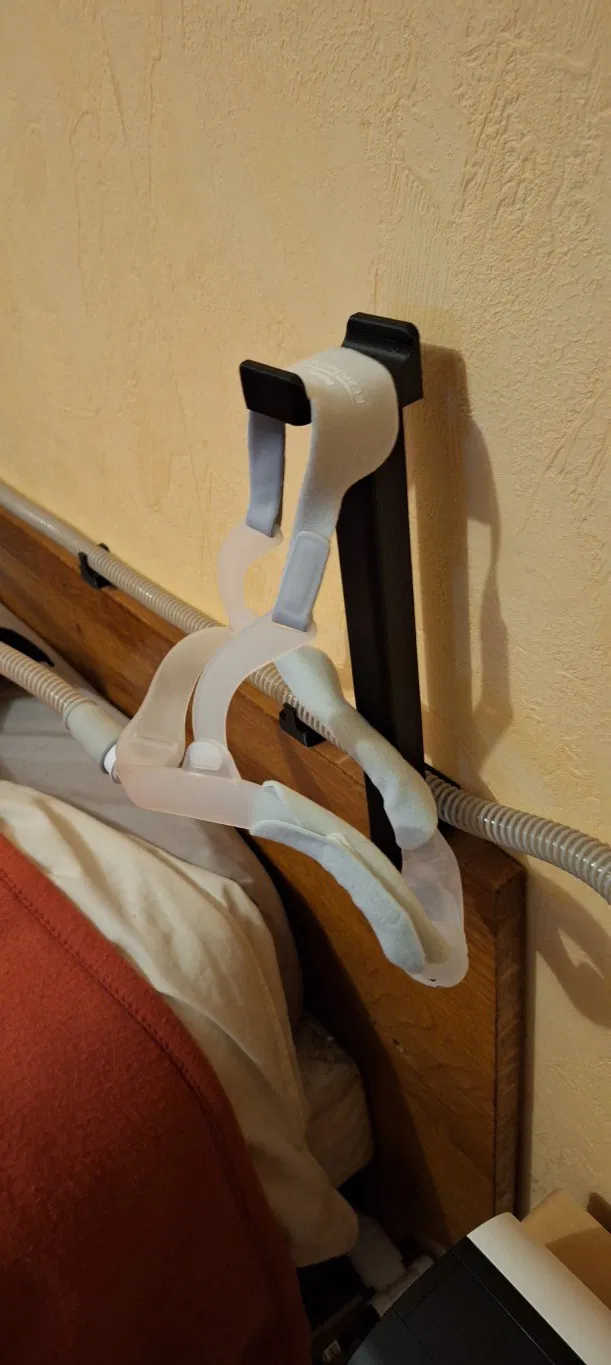 Sản phẩm này là giá đỡ ống (đường kính 18mm) và mặt nạ dành cho máy hỗ trợ hô hấp. Lắp đặt dễ dàng bằng vít hoặc băng dính hai mặt, giúp quản lý ống và mặt nạ gọn gàng, tiện lợi.