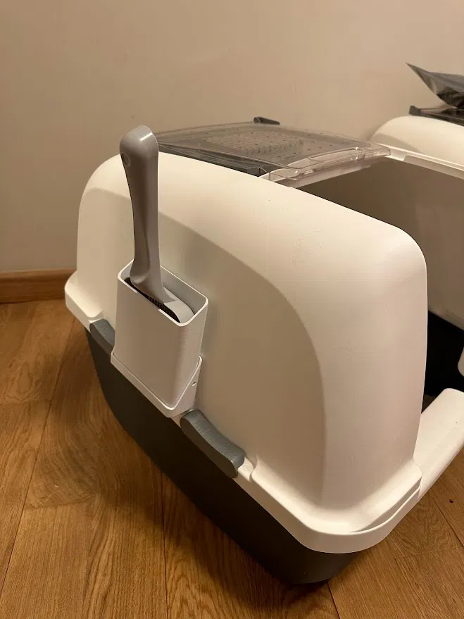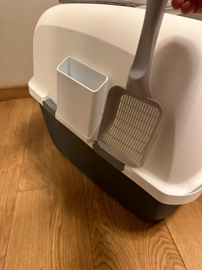 Kệ đựng muỗng vệ sinh cho mèo, với bộ phận có thể tháo rời để giặt sạch sẽ, phù hợp với muỗng rộng tới 110mm. Thiết kế không cần support, có 2 kiểu đế, một kiểu có lỗ treo tiện lợi. Infill 15%.