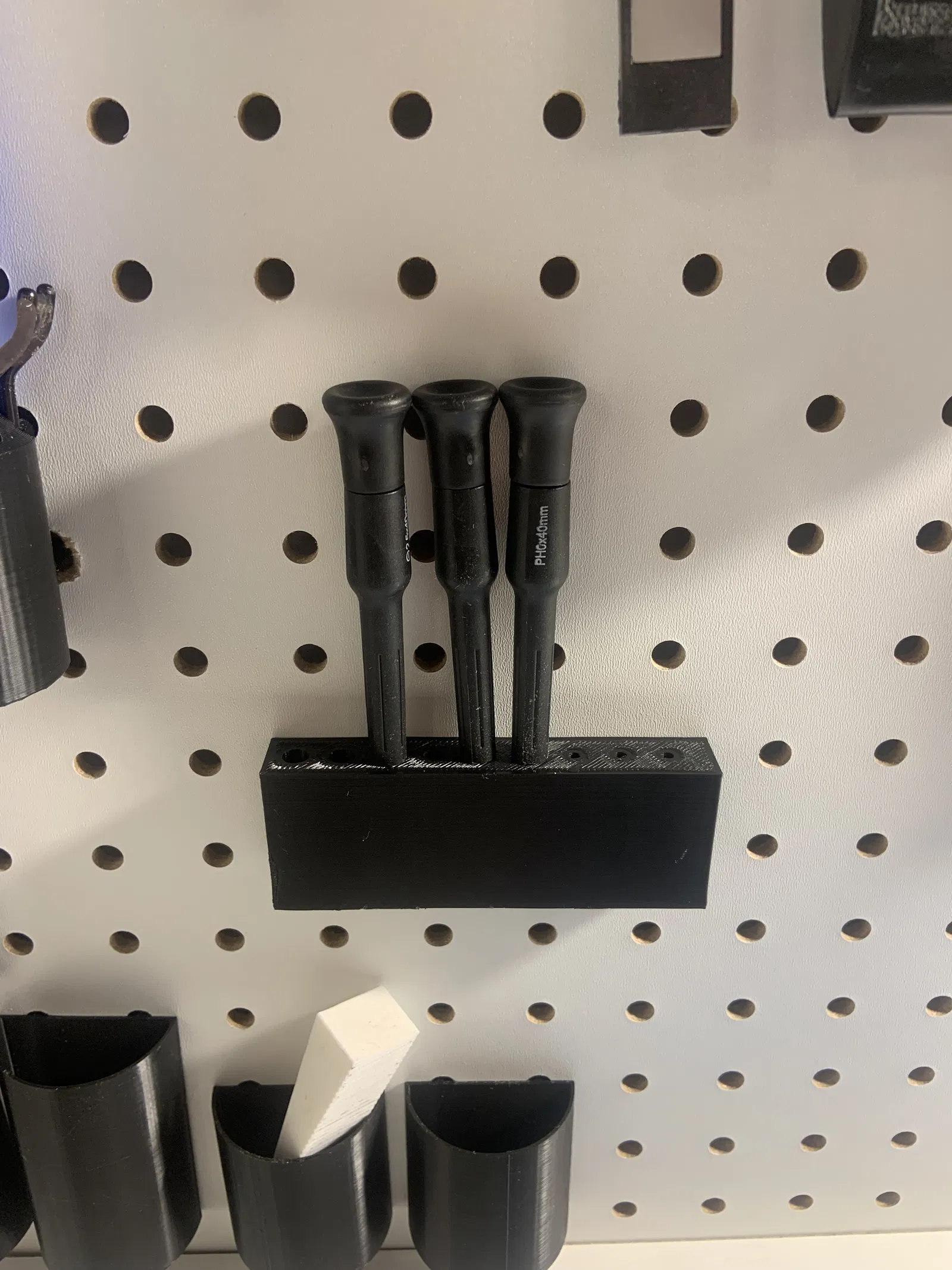 Tổ Chức Tua Vít Nhỏ Cho Peg Board là phụ kiện lý tưởng để giữ cho các dụng cụ của bạn gọn gàng. Sản phẩm được thiết kế trên OnShape và in ấn bằng công nghệ tiên tiến, với các kích thước lỗ được thiết kế tỉ mỉ cho nhiều loại tua vít khác nhau.