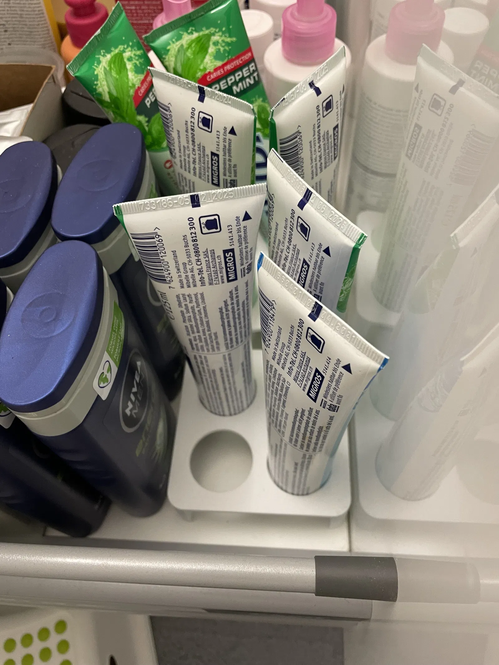 Cái giá đỡ này có đế hình chữ nhật với bốn lỗ hình trụ để giữ chặt các tuýp kem đánh răng, ngăn chúng bị đổ.